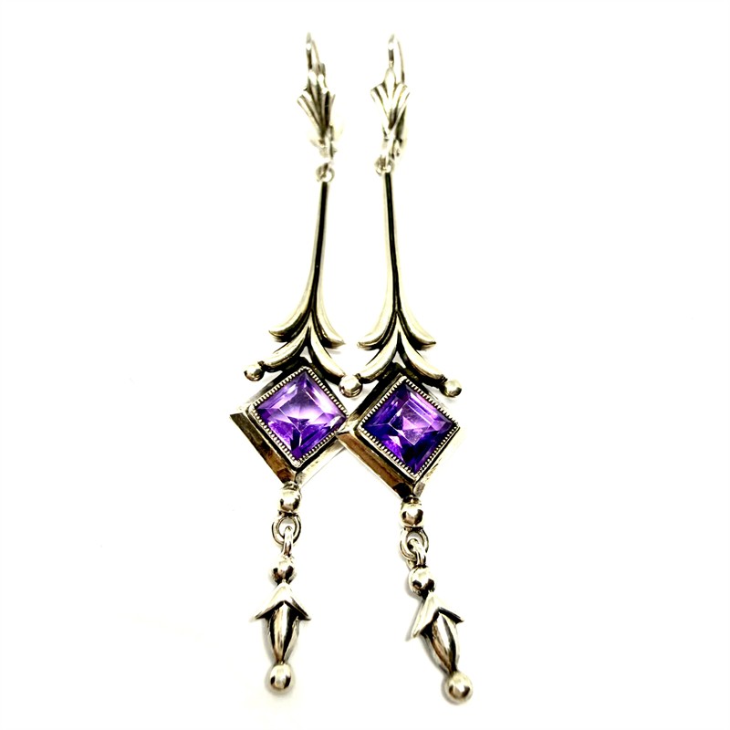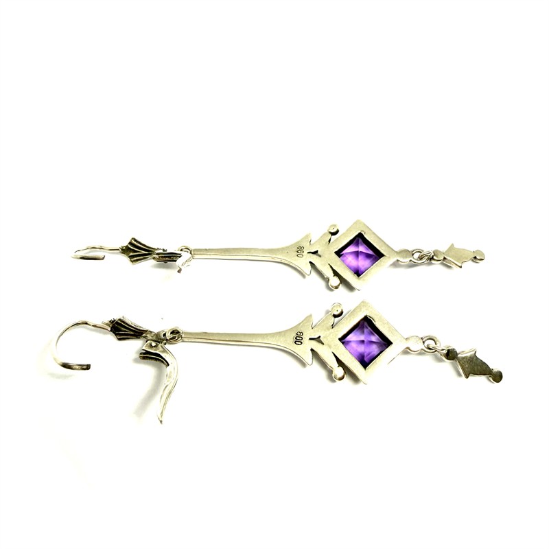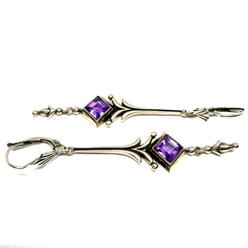 Velmi půvabné, dlouhé, závěsné náušnice z období první republiky. Náušnice byly zhotoveny ze stříbra ryzosti 800/1000, o celkové váze 4,16 g. Délka 6 cm. Náušnice byly profesionálně vyleštěny. Perfektní stav.