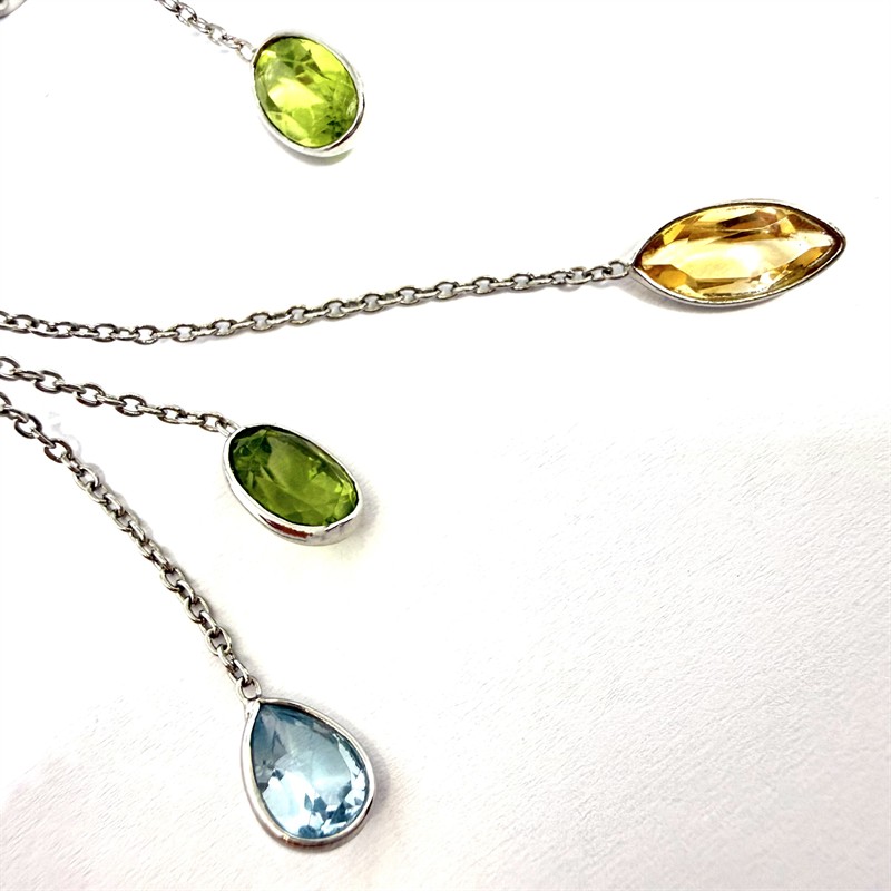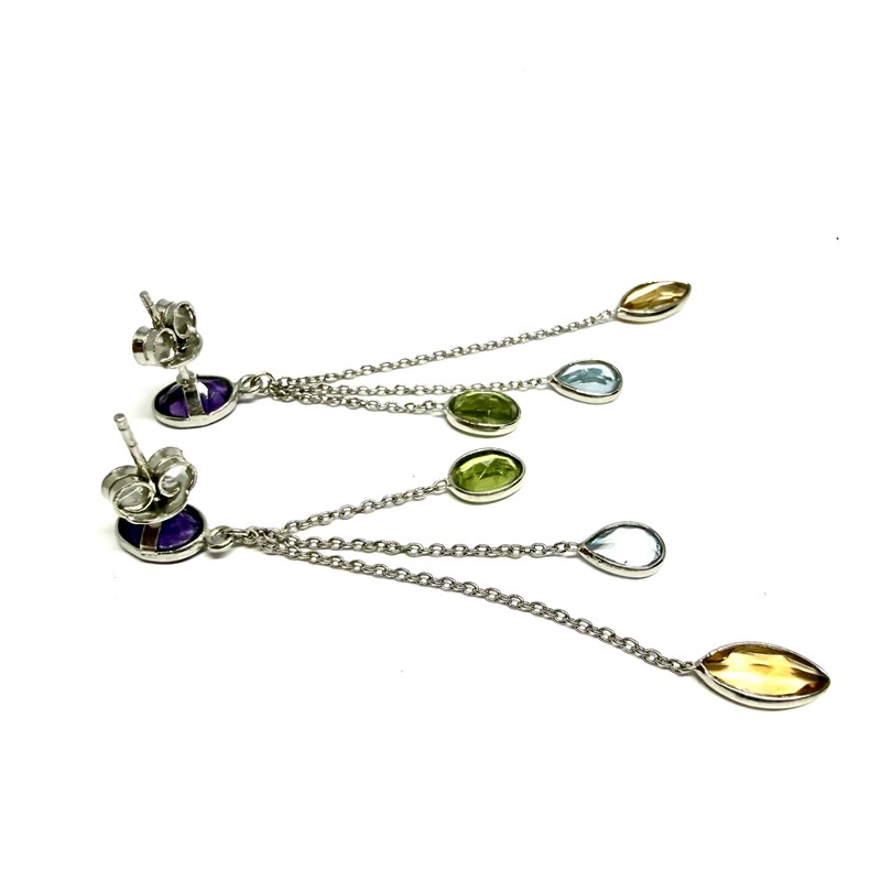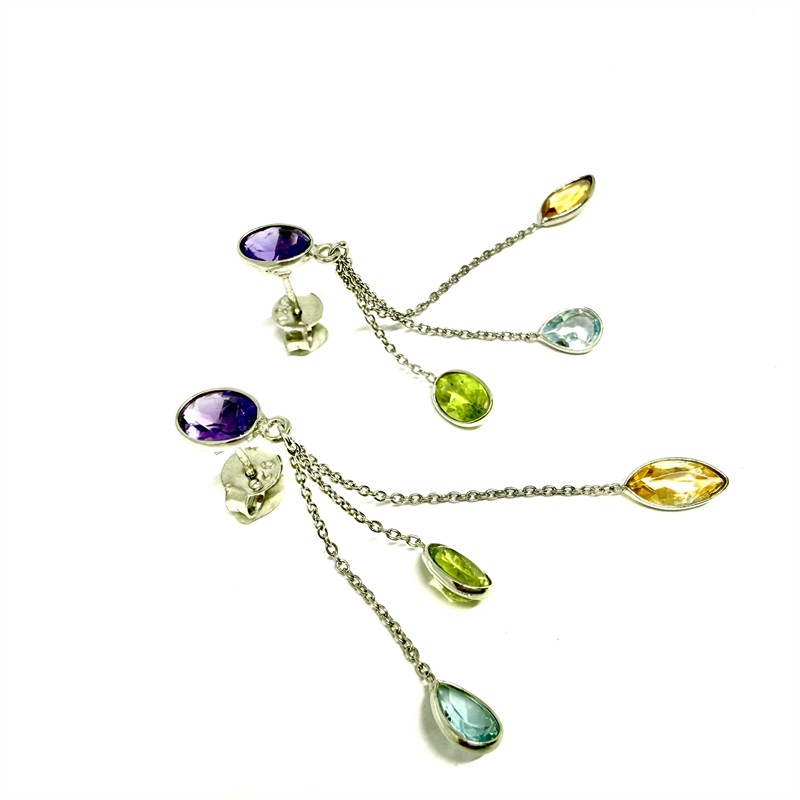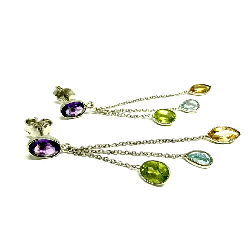 Půvabné, delší náušnice ze stříbra zdobené drahými kameny přírodního původu. Ryzost stříbra 925/1000 (Sterling), váha 3,53 g. Délka 6,2 cm. Náušnice zdobí tři jemné, půvabné řetízky zakončené drahým kamenem fazetového brusu. Jedná se o ametyst , citrín, olivín a topaz. Zapínání na puzetu. Perfektní stav.