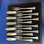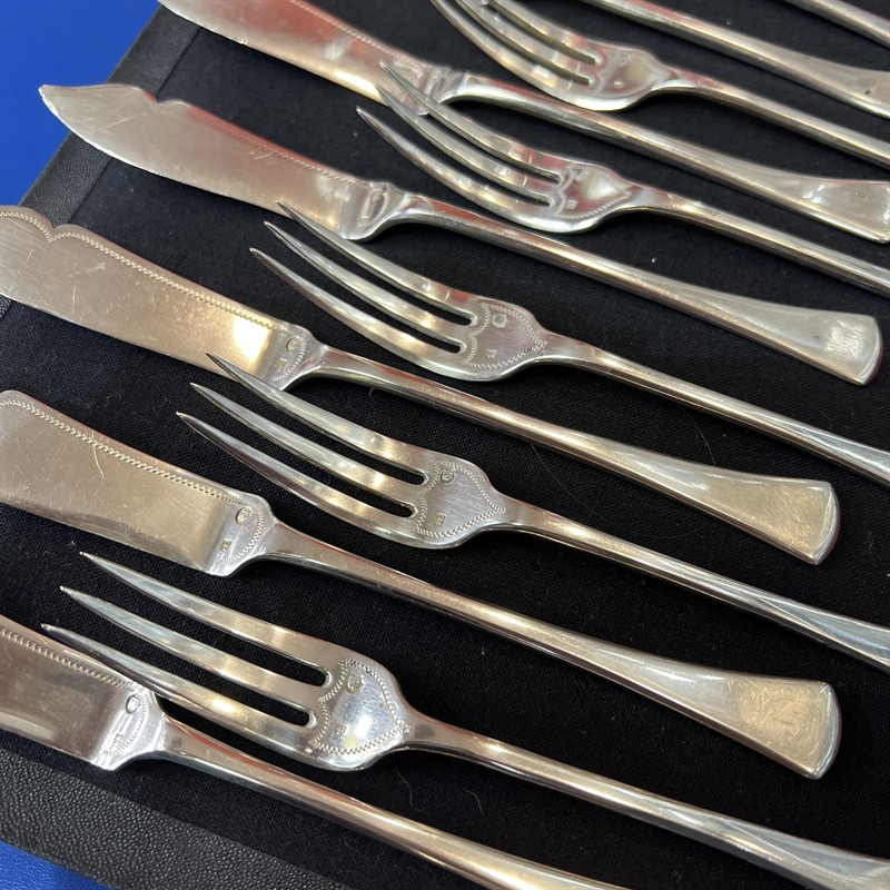 Stříbrné rybí příbory pro šest osob, stříbro o ryzosti 800/1000 o celkové hmotnosti 324,68 g puncovní značení z První republiky z let 1920 - 1929, délka nože: 17 cm, šířka: 1,5 cm, délka vidličky: 15 cm, šířka: 1,8 cm