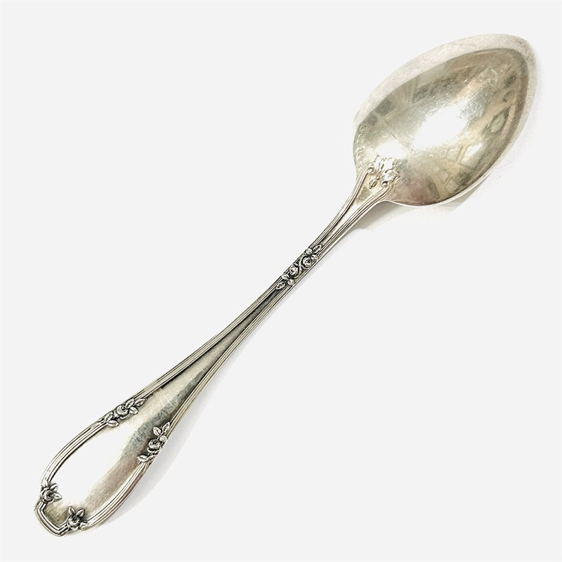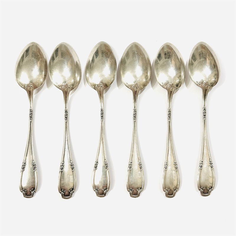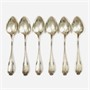 Půvabná souprava skládající se z 6 lžiček v klasicizujícím secesním stylu, oboustranně kraje střenky s jemným plastickým stužkovým reliéfem s květy růže. Tradiční design stolního stříbra, solidní německá stříbrnická práce z konce 19. století. Zhotoveno z nezlaceného stříbra o ryzosti 800/1000; vyhotoveno osvědčení puncovního úřadu, německý punc "srpek měsíce s korunou" a ryzostní číslo zvnějšku misky. Celková hmotnost 144,90 g, délka 14 cm, šířka 29 mm. Ponecháno s lehkou přirozenou patinou, lze vyčistit, celkově v zachovalém stavu.