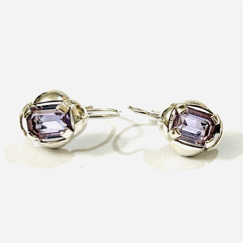 Decentní, designem nadčasové náušnice s hlavicí ve tvaru protáhlého kvadrilobu, ve středu osazeno světle fialovým skleněným kamenem obdélného brusu. Kvalitní práce klenotnického družstva Jablonecká bižuterie z 60. až 80. let 20. století. Zhotoveno z nezlaceného stříbra o ryzosti 900/1000; punc S-67 (zajíc 3) a značka výrobce "JB" dřících. Hmotnost 3,06 g, celková délka 18 mm, šířka 10,5 mm. Klapkové zapínání v pořádku, celkově v zachovalém stavu, odborně vyčištěno a vyleštěno zlatníkem.