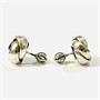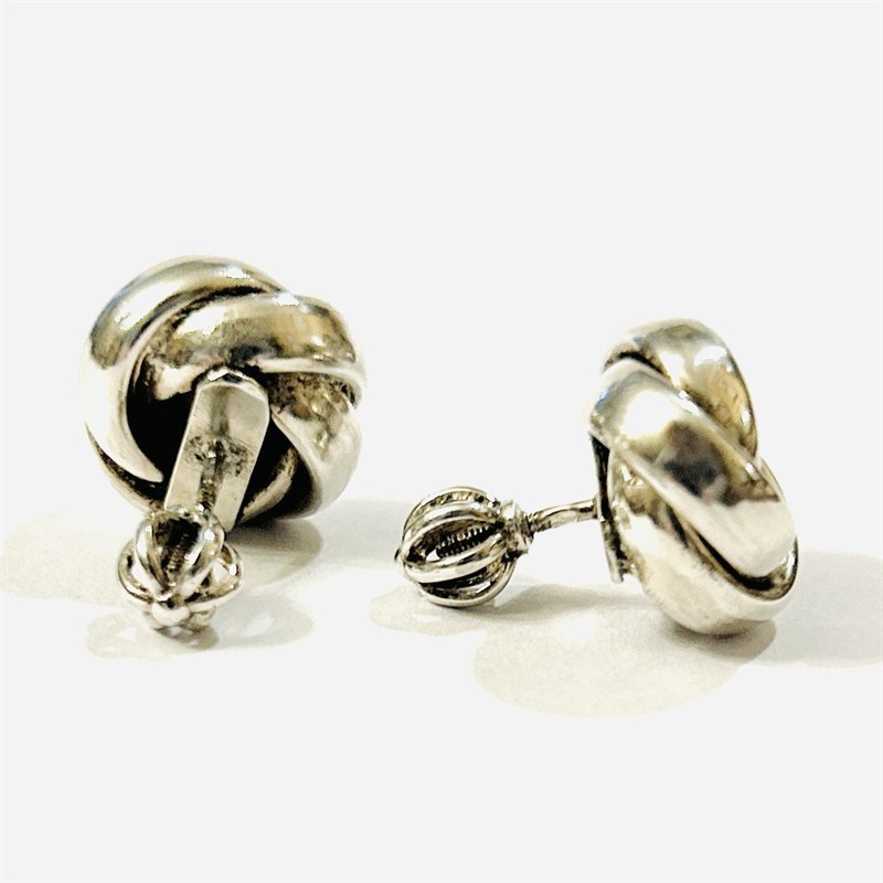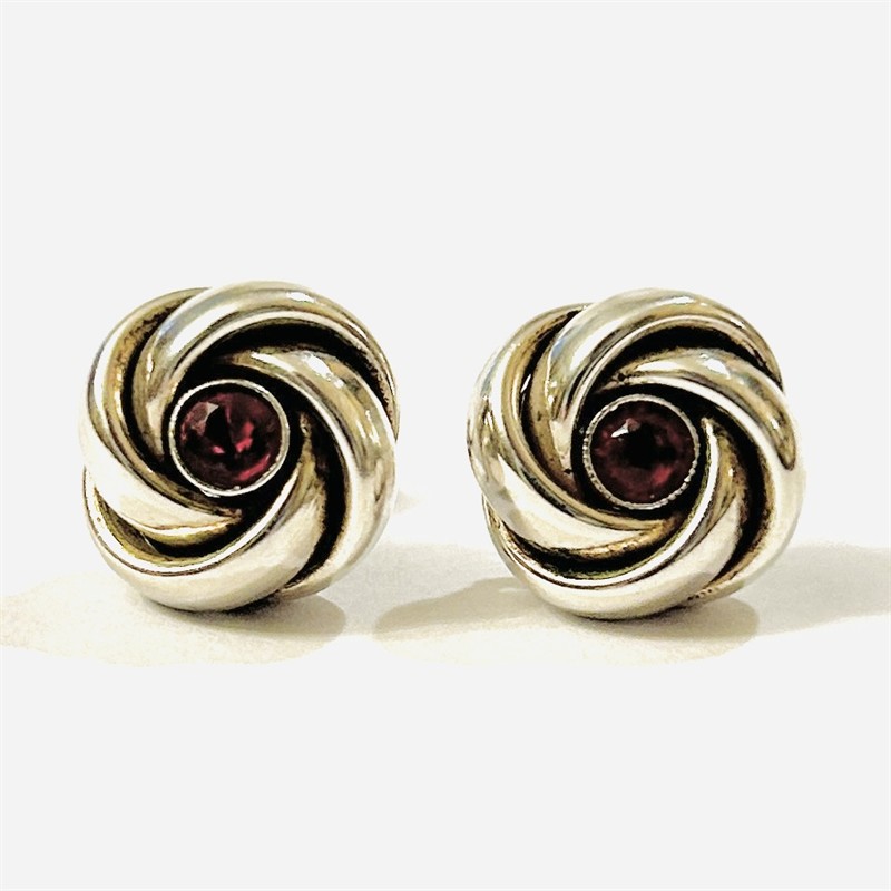 Elegantní, nadčasové náušnice s hlavicí ve tvaru uzlu, ve středu osazeno červeným kamenem kulatého brusu v zrnité obrubě. Solidní tuzemská zlatnická práce, patrně ze 40. let 20. století. Zhotoveno z nezlaceného stříbra o ryzosti 800/1000; nově opatřeno puncem S-69 (zajíc 5) na dřících. Hmotnost 5,27 g, průměr hlavice 13 mm. Zapínání formou šroubovací puzety (balonek) v pořádku, celkově v zachovalém stavu, odborně vyčištěno a vyleštěno.