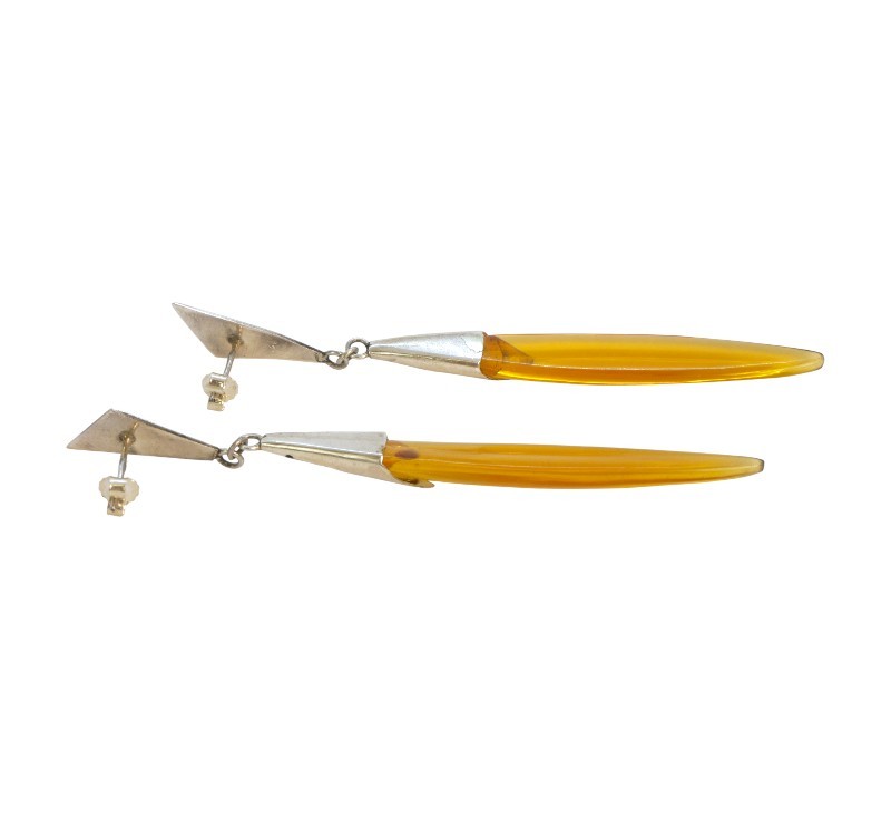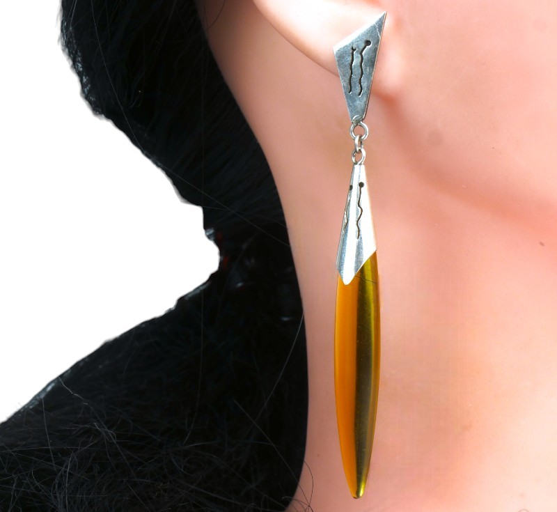 Elegantní stříbrné visací náušnice s imitací jantaru. Stříbro ryzost 925/1000, hmotnost 8,32 g. Délka náušnic 8,5 cm.