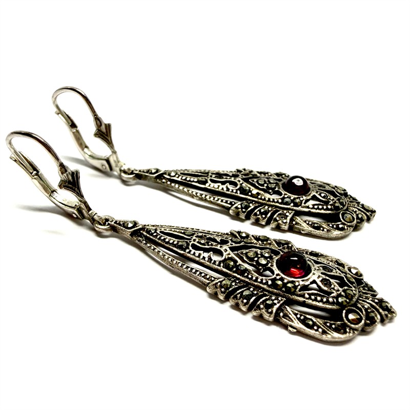 Velmi půvabné, delší, závěsné stříbrné náušnice. Zdobeny drobnými, elegantními markazity a kontrastně almandinem hladkého brusu kabošon. Sterlingové stříbro (925/1000), váha 5,29 g. Délka 5 cm. Některé z drobných markazitů chybí, viditelné lupou, nikoliv při nošení - výrazně zohledněno v ceně.