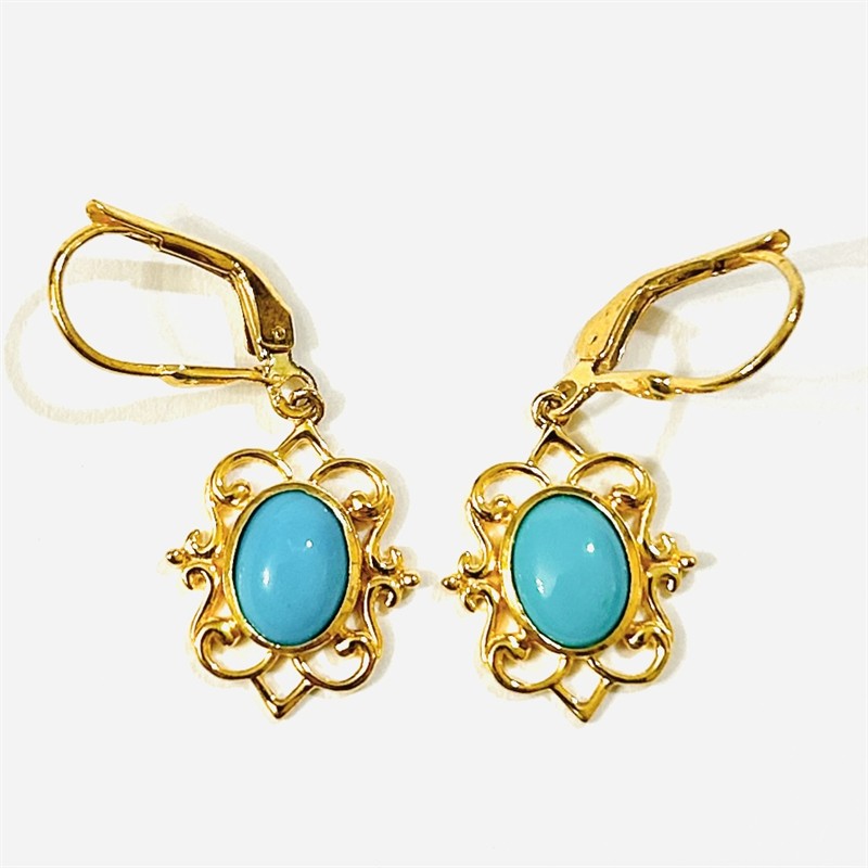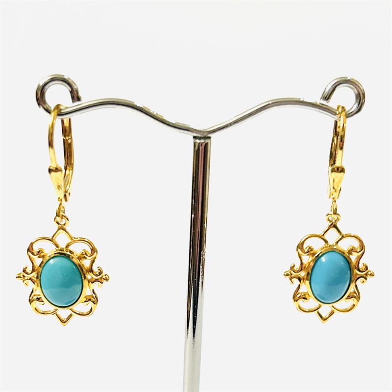 Velice elegantní visací náušnice s prořezávanými ověsky v historizujícím tvarosloví, osazeno v plně přiléhajících obrubách oválnými muglemi přírodního tyrkysu odstínu "sleeping beauty" (původem z USA). Netuzemská šperkařská práce z 10. let 21. století od maďarské firmy Emporia. Zhotoveno ze zlaceného stříbra o ryzosti 925/1000; ryzostní číslo na klapkách. Hmotnost 3,02 g, celková délka 33 mm, šířka 13,5 mm. Klapkové zapínání v pořádku. Nenošeno, v intaktním stavu, součástí certifikát.
