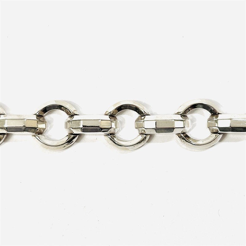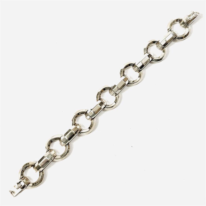 Výrazný, geometricky pojatý náramek s kulatými a obdélnými články s efektními fazetami. Kvalitní zlatnická práce pražské klenotnického podniku Primosa z let 1941-1944. Zhotoveno z nezlaceného stříbra o ryzosti 800/1000; protektorátní punc S-53 (šachovnice 5), ryzostní číslo a mistrovská značka "PA" na zapínání. Hmotnost 25,03g, délka 19,2 cm, šířka 18 mm. Jazýčkové zapínání včetně "8" pojistky v pořádku, u zapínání letováno (není příliš patrné), jinak v zachovalém stavu, odborně vyčištěno a vyleštěno zlatníkem.