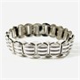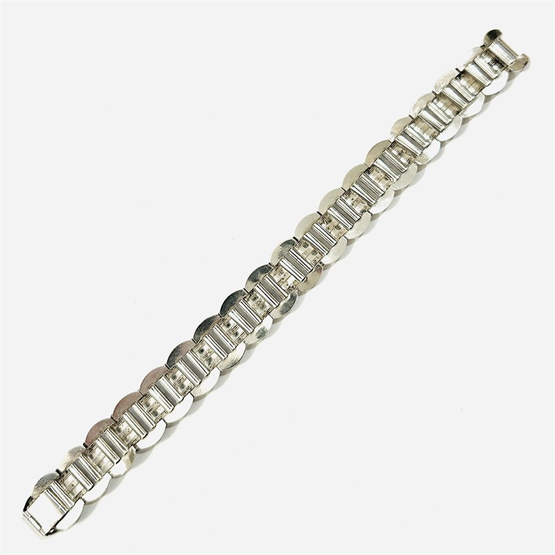 Starožitný náramek z úzce kladené pásové vazby, geometricky pojaté články zdobeny decentními rovnoběžnými rytými liniemi. Kvalitní práce pražského klenotníka Josefa Nováka z let 1941 až 1944. Zhotoveno z nezlaceného stříbra o ryzosti 900/1000; protektorátní punc S-51 (šachovnice 3), ryzostní číslo a mistrovská značka "JN" na koncích. Hmotnost 18,23 g, délka 19 cm, šířka 15 mm. V zachovalém stavu, odborně vyčištěno a vyleštěno zlatníkem.