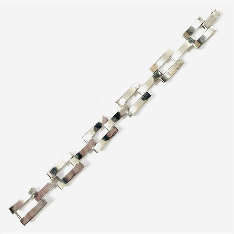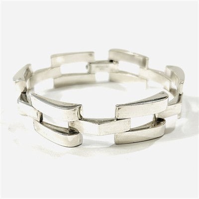 Elegantní, tvarově nadčasový náramek z období art-deco s geometricky pojatými hladkými články. Kvalitní zlatnická práce pražské klenotnického podniku Primosa z 2. poloviny 30. let 20. století. Zhotoveno z nezlaceného stříbra o ryzosti 835/1000; prvorepublikový punc S-47 (slovenské trojvrší 4), ryzostní číslo a značka výrobce "PRIMOSA" na zapínání. Hmotnost 20,56 g, délka 19 cm, šířka 14 mm. Zapínání v pořádku, celkově v zachovalém stavu, odborně vyčištěno a vyleštěno zlatníkem.