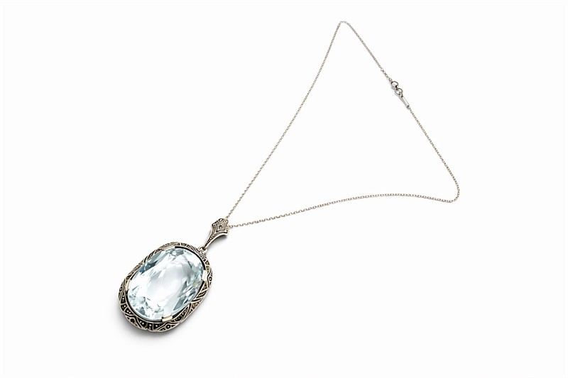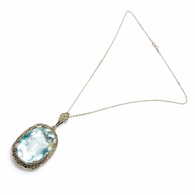 Půvabný, stříbrný náhrdelník zdobený odnímatelným závěsem zhotoveným ve stylu Art deco v první polovině 20.století. Šperk zdobí světle modrý akvamarín fazetového brusu. Stříbro ryzosti 935/1000. Řetízek dlouhý 42 cm. Závěs cca 3 x 1,5 cm. Celková váha šperku 5,80 g. Výborný stav.