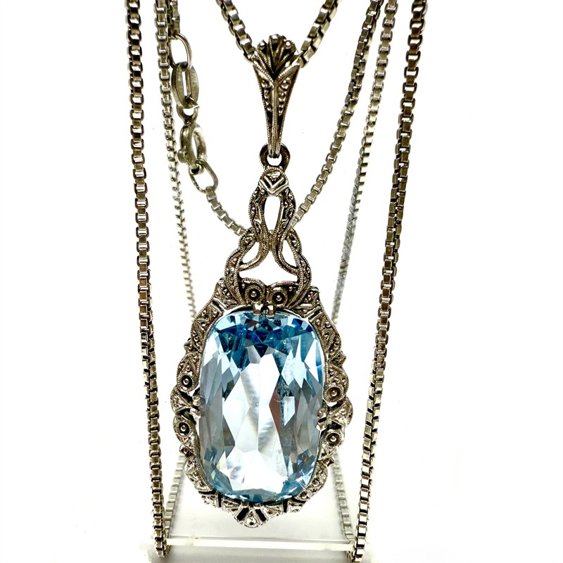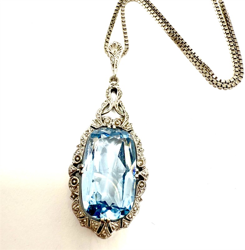 Půvabný, jemně dekorovaný stříbrný náhrdelník - řetízek s odnímatelným závěsem zhotoveným ve stylu Art deco. Šperk zdobí blankytně modrý spinel fazetového brusu. Závěs byl vyroben ze sterlingového stříbra (925/1000), o celkové váze 10,69 g. Řetízek délky 52 cm byl vyroben ze stříbra ryzosti 835/1000. Autentický, starý šperk v perfektním stavu.
