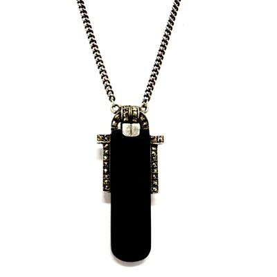 Elegantní, nadčasový, stříbrný náhrdelník zhotovený ve stylu Art deco. Šperk byl vyroben ze sterlingového stříbra (925/1000), o celkové váze 13,18 g. Náhrdelníku vévodí destička z černého onyxu, jež je kontrastně dozdobena drobnými elegantními markazity. Délka 40 cm. Perfektní stav.