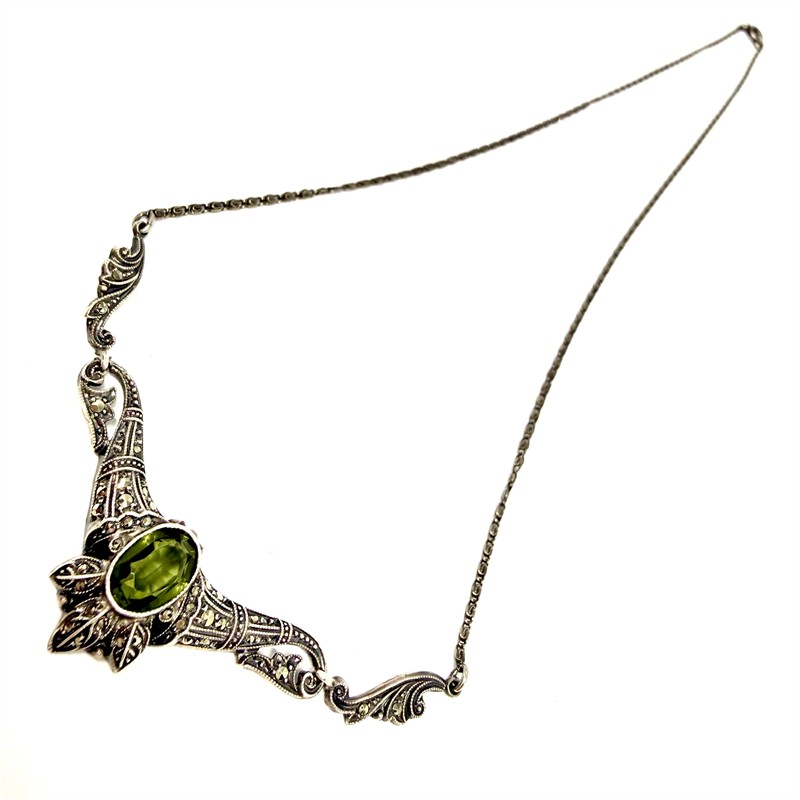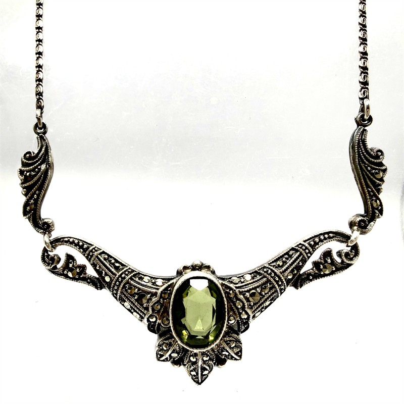 Půvabný, něžný náhrdelník zhotovený ze stříbra ve stylu Art deco. Volutový řetízek zdobí tvarovaný ověs osazený na středu tmavě zeleným, transparentním kamenem a mnoha drobnými, elegantními markazity. Šperk byl vyroben ze stříbra sterlingové ryzosti (925/1000). Celková váha 6,17 g. Délka 43,5 cm. Výborný stav.