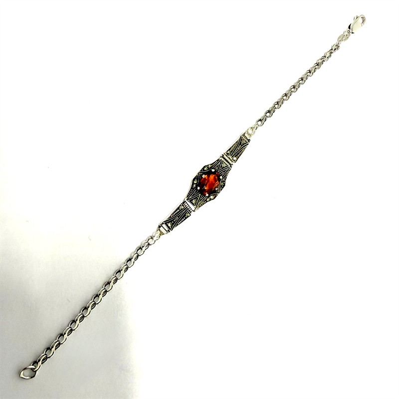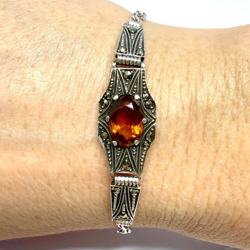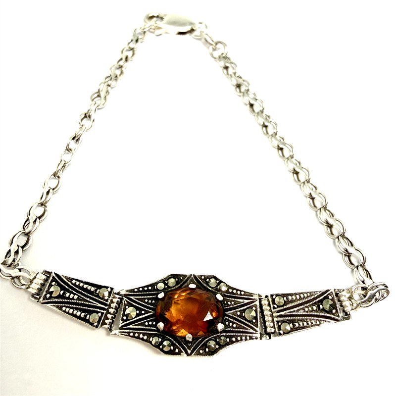 Půvabný stříbrný náramek zhotovený ve stylu Art deco. Šperk zdobí jemná rozeta osazená koňakovým madeira citrínem a elegantně se třpytícími markazity. Šperk byl zhotoven ze sterlingového stříbra (925/1000), celková váha 6,09 g. Délka 18,5 cm. Náramek byl profesionálně vyčištěn a je ve výborném stavu.