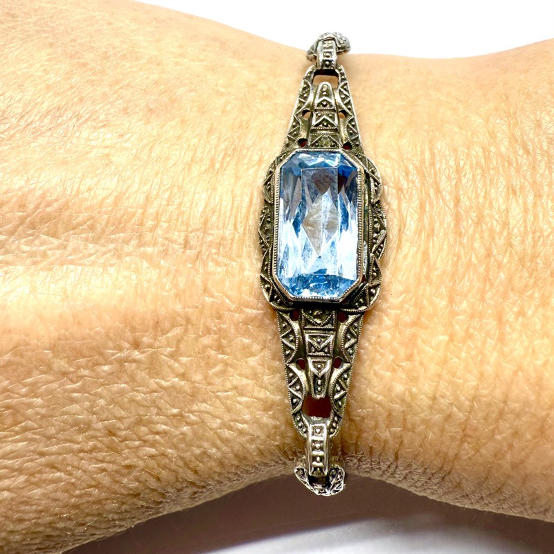 Elegantní šperk zhotovený ze stříbra ve stylu Art deco v první polovině 20. století. Náramek byl vyroben ze stříbra ryzosti 835/1000, o váze 8,28 g. Přední část osazena bledě modrým spinelem fazetového brusu. Délka 18,5 cm. Funkční pojistka zapínání. Výborný stav.