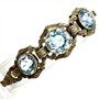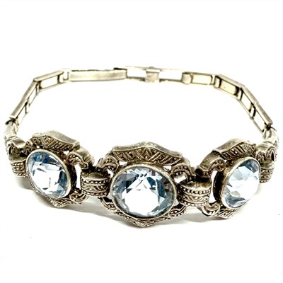 Velmi půvabný, stříbrný náramek zdobený třemi jiskrnými, světle modrými spinely fazetového brusu. Šperk byl vyroben v první polovině 20.století ve stylu Art deco ze stříbra ryzosti 925/1000. Váha 15,06 g. Délka 18,5 cm. Stříbrné články jsou pružné. Starý, dobový šperk v perfektním stavu.