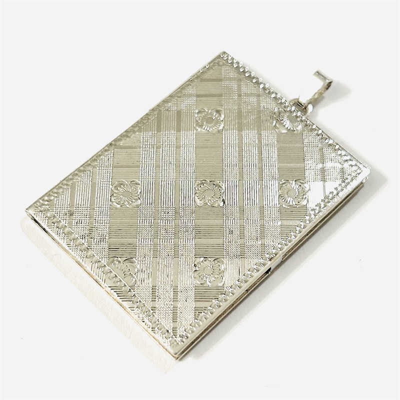 Velký přívěšek z období art-deco ve tvaru obdélné knížky, jež slouží jako medailon na fotografie. Z obou stran dekorováno gilošováním, přední strana a vnitřní rámečky dozdobeny gravírováním. Symbolický šperk, kvalitní práce pražského klenotnického družstva Primosa z první poloviny 40. let 20. století. Zhotoveno z nezlaceného stříbra o ryzosti 835/1000; protektorátní punc S-52 (šachovnice 4), ryzostní číslo, značka výrobce "PRIMOSA" a výrobní číslo "34" zevnitř. Hmotnost 24,17 g, celková délka 43 mm, šířka 24 mm. Zavírání v pořádku, celkově v zachovalém stavu, odborně vyčištěno a vyleštěno zlatníkem.