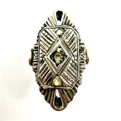 Půvabný, stříbrný prsten zhotovený v první polovině 20.století ve stylu Art deco. Šperk byl vyroben ze stříbra ryzosti 835/1000, o celkové váze 3,14 g. Velikost 53,5. Perfektní stav.