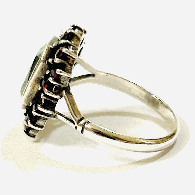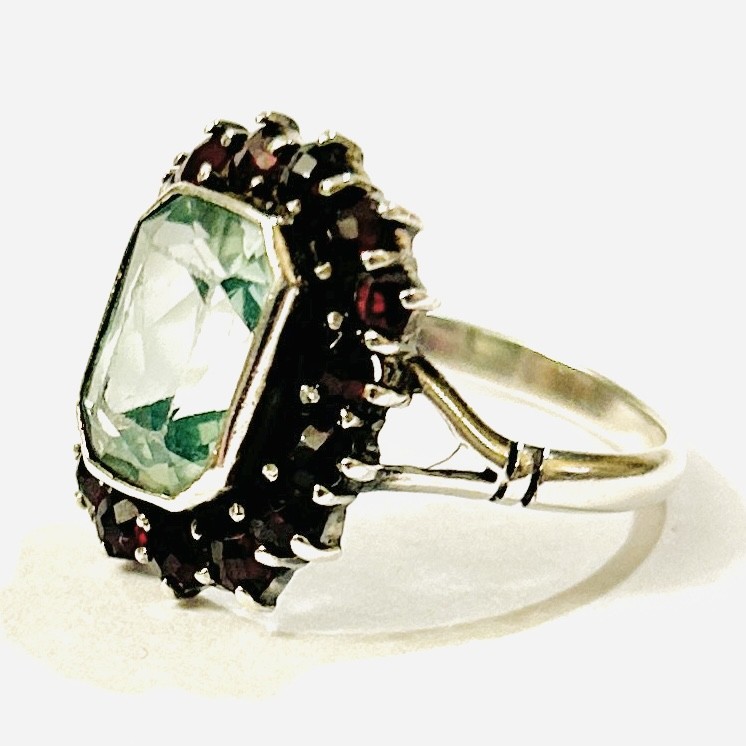 Elegantní prsten z období art-deco, hlavice osazena centrálním modro-zeleným kamenem obdélného brusu, rámováno českými granáty kulatého šachovnicového brusu, fasováno obrubou a zrnkovou technikou. Tuzemská granátnická práce z 30. let 20. století. Zhotoveno z nezlaceného stříbra o ryzosti 900/1000; prvorepublikový punc S-46 (slovenské trojvrší 3), ryzostní číslo a mistrovská značka zevnitř šíny. Hmotnost 3,98 g, velikost 58, délka hlavice 17 mm, šířka 19 mm. Centrální kámen lehce uvolněný a podřený, nehrozí však vypadnutí, stopy nošení, celkově v dobrém stavu.