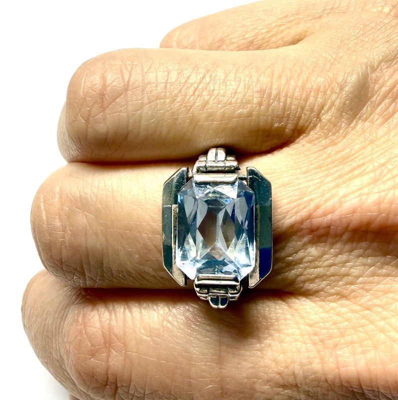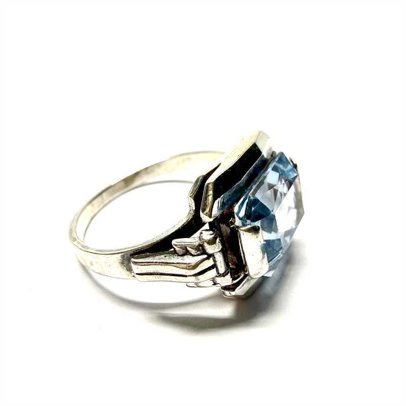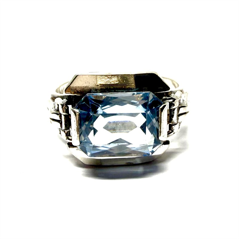 Elegantní, stříbrný šperk zhotovený v čistém stylu Art deco v první polovině 20.století. Ryzost stříbra 900/1000, celková váha šperku 5,87 g. Velikost 61,5. Šperk je osazen blankytně modrým spinelem fazetového brusu. Profesionálně vyleštěno, perfektní stav.