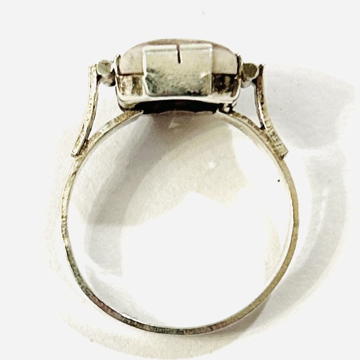 Elegantní prsten z období art-deco osazený přírodním karlovarským vřídlovcem obdélného plochého zaobleného brusu, lišty hlavice jemně ryty. Kvalitní zlatnická práce turnovského klenotníka Josefa Hokeho z 30. let 20. století. Zhotoveno z nezlaceného stříbra o ryzosti 800/1000; prvorepublikový punc S-48 (slovenské trojvrší 5) zvnějšku šíny, ryzostní číslo a mistrovská značka "JH" zevnitř šíny. Hmotnost 3,52 g, velikost 60,5, délka hlavice 14 mm. V zachovalém stavu, odborně vyčištěno a vyleštěno zlatníkem.