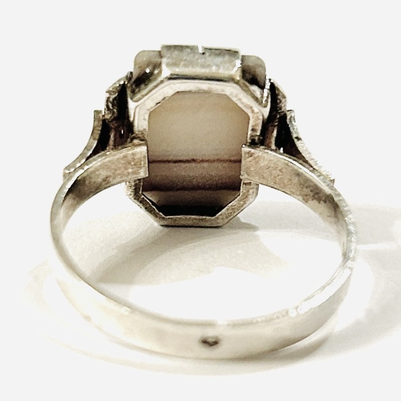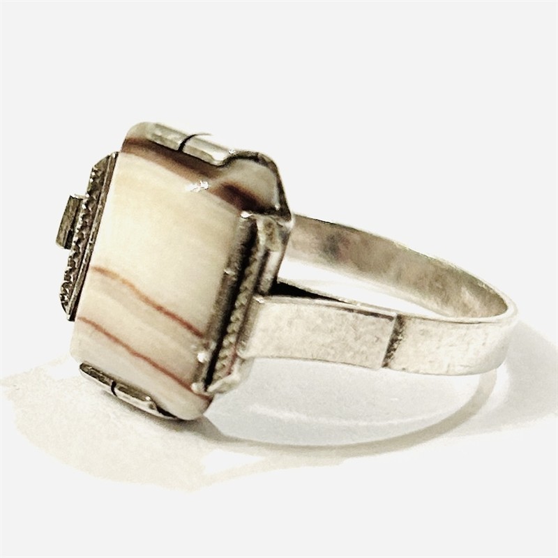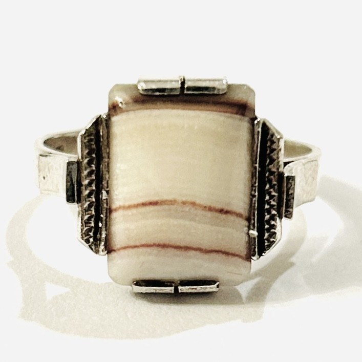 Elegantní prsten z období art-deco osazený přírodním karlovarským vřídlovcem obdélného plochého zaobleného brusu, lišty hlavice jemně ryty. Kvalitní zlatnická práce turnovského klenotníka Josefa Hokeho z 40. let 20. století, potažmo z 2. poloviny 30. let 20. století s označením po roce 1945. Zhotoveno z nezlaceného stříbra o ryzosti 800/1000; československý punc S-48 (kozlík 5) zvnějšku šíny, ryzostní číslo a mistrovská značka "JH" zevnitř šíny. Hmotnost 3,64 g, velikost 62, délka hlavice 14 mm, šířka 15 mm. Ve velmi zachovalém stavu, odborně vyčištěno a vyleštěno zlatníkem.