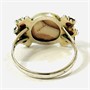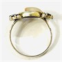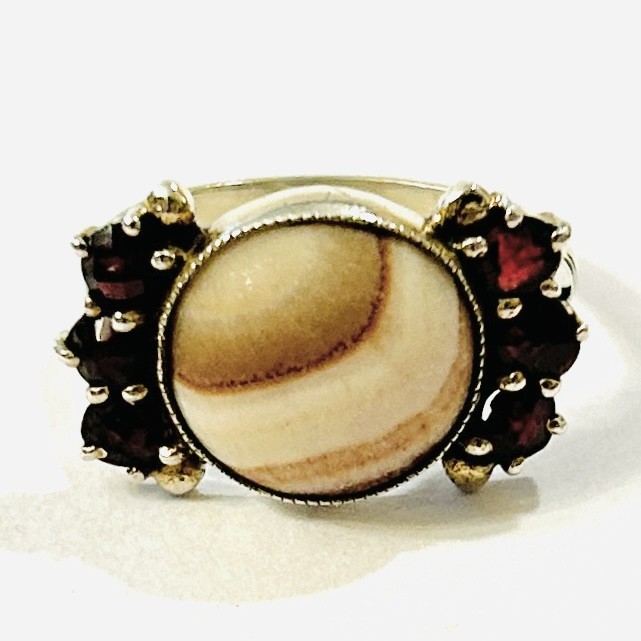 Elegantní prsten z období art-deco, hlavici dominuje kulatá mugle přírodního vřídlovce, po stranách doplněno českými granáty kulatého šachovnicového brusu a granulovanými kuličkami, fasováno zrnitou obrubou a zrnkovou technikou. Moderní design v kombinaci dvou typických českých minerálů, tuzemská granátnická práce z 30. let 20. století. Zhotoveno z nezlaceného stříbra o ryzosti 900/1000; prvorepublikový punc S-46 (slovenské trojvrší 3), ryzostní číslo a mistrovská značka "S12" a další značka zevnitř šíny. Hmotnost 3,10 g, velikost 59, délka hlavice 21 mm, šířka 12 mm. V zachovalém stavu, odborně vyčištěno a vyleštěno zlatníkem.