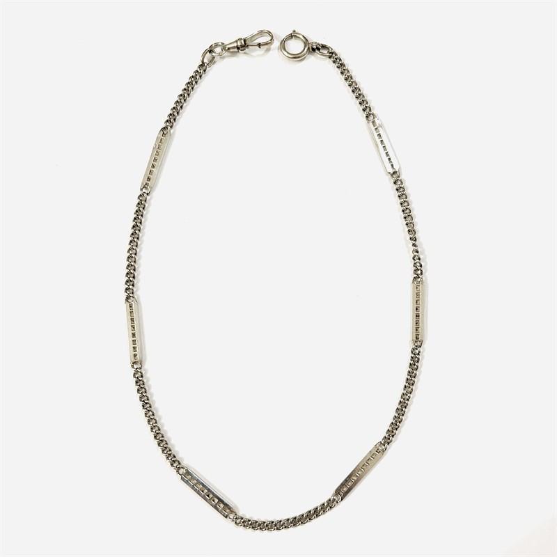 Starožitný decentnější řetízek k hodinkám/šatlén z období art-deco, skládající se z řetízkoviny vazby "pancr" prokládanou podlouhlými články s plastickým čtverečkovaným pásem. Lze nosit i jako kratší řetízek na krk. Solidní tuzemská zlatnická práce z 30. let 20. století. Zhotoveno z nezlaceného stříbra o ryzosti 800/1000; prvorepublikový punc S-48 (slovenské trojvrší 5) a ryzostní číslo na několika místech. Hmotnost 10,58 g, délka 37,5 cm, šířka 3,5 mm. Zapínání formou karabiny a pérového kroužku v pořádku, celkově ve velmi zachovalém stavu, odborně vyčištěno.