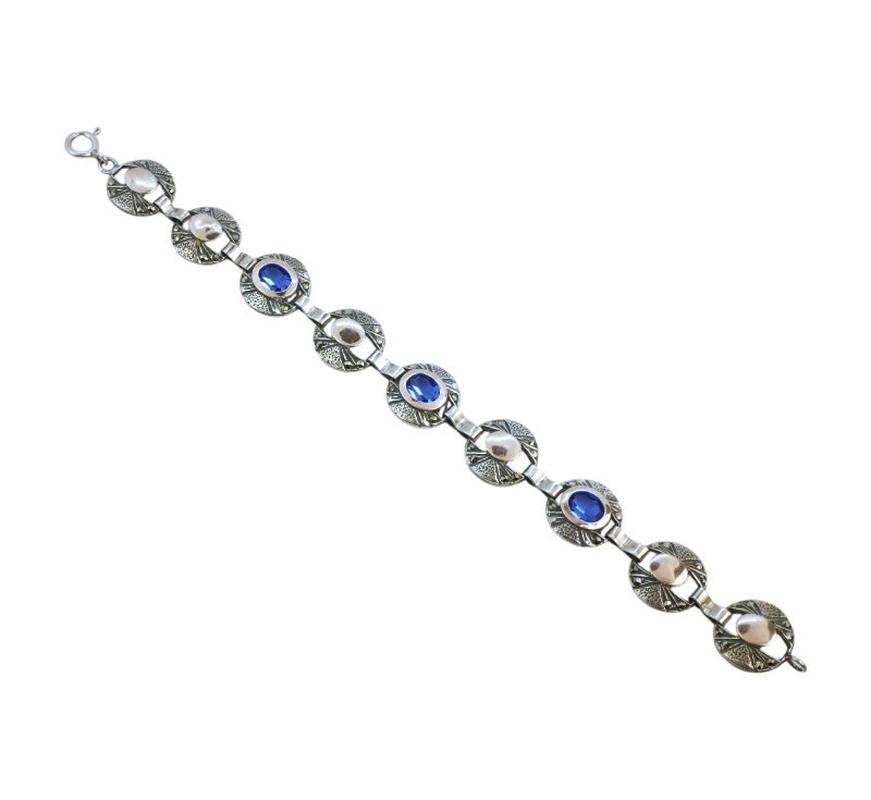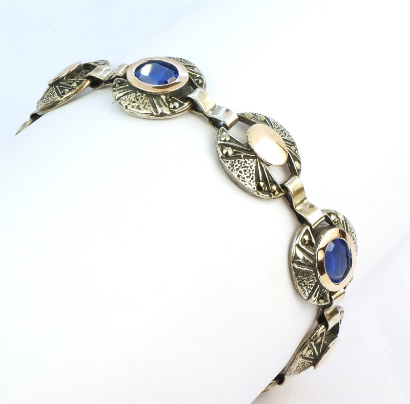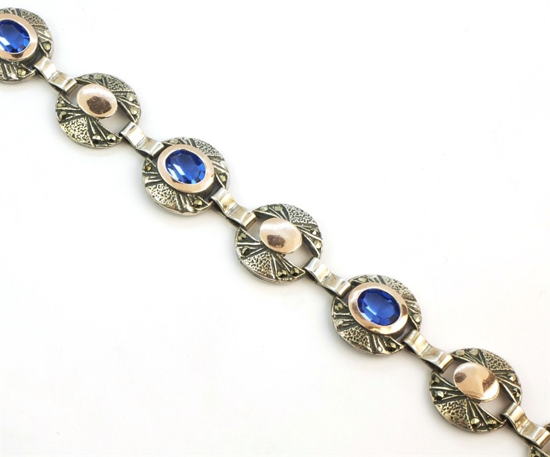 Elegantní článkový náramek vyrobený ze stříbra ryzosti 925/1000, částečně zlacený a zdobený markazity a na třech článcích výrazně modrými kameny. Délka náramku je 20,5 cm. Hmotnost 23,67 g.