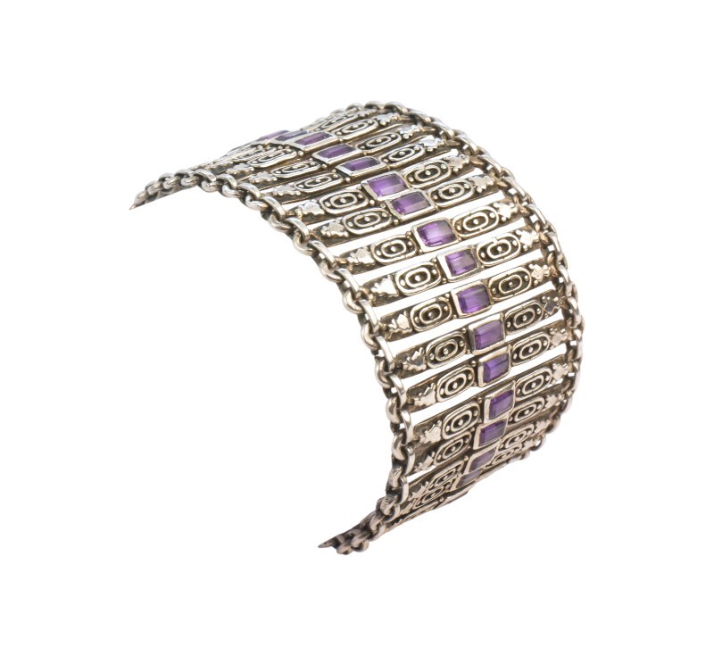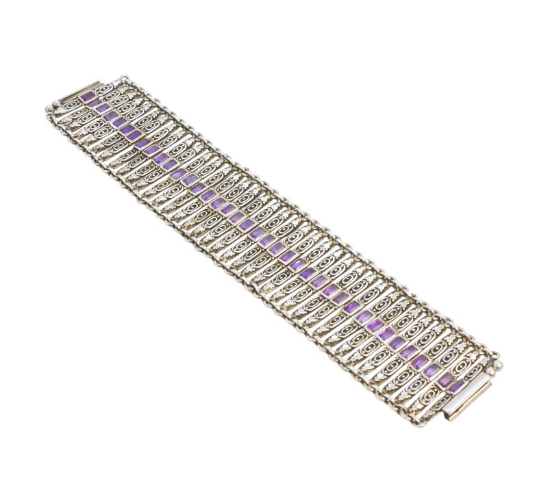 Široký článkový náramek vyrobený ze stříbra ryzosti 925/1000, zdobený ametysty. Délka náramku 17,5 cm, šířka 3,5 cm. Celková hmotnost 52,80 g.
