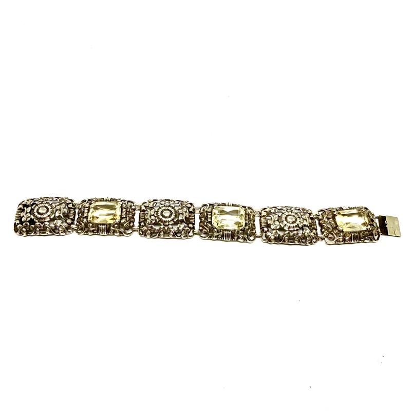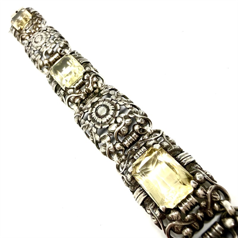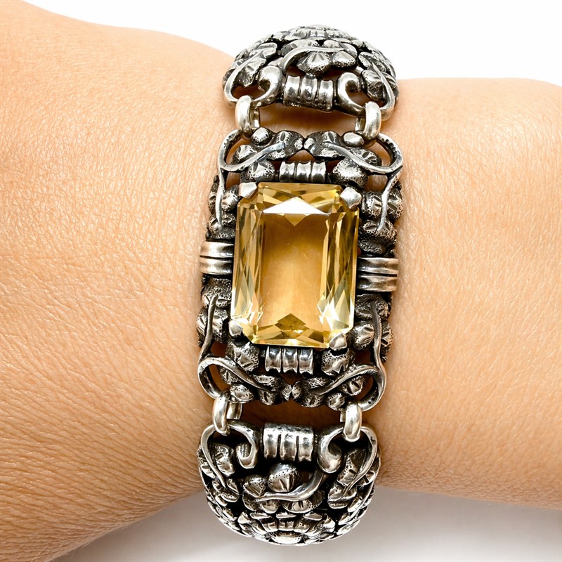 Výrazný,článkový náramek z období první republiky. Šperk byl zhotoven ze sterlingového stříbra(925/1000) o celkové váze 37,60 g. Jednotlivé články zdobí plastický,florální motiv či jiskrný,fazetově vybroušený citrín střední barevné sytosti. Délka 18,5 cm,šířka 2 cm. Perfektní stav.