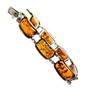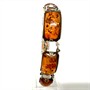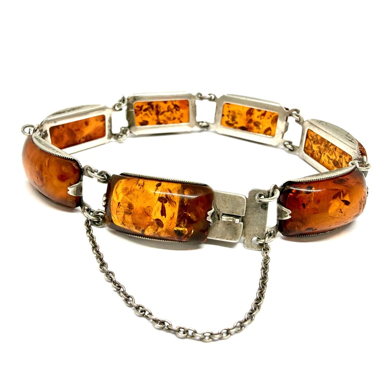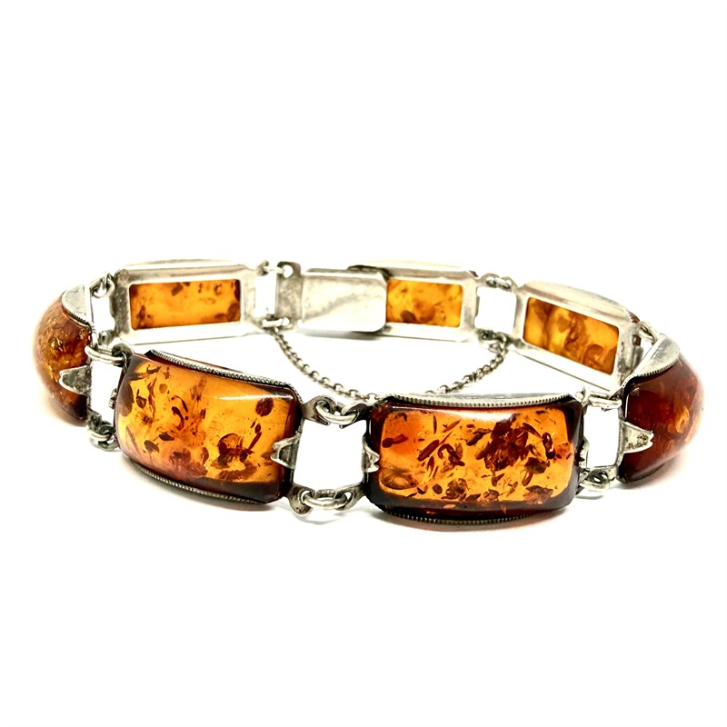 Elegantní, nadčasový jantarový náramek. Šperk byl zhotoven ze stříbra ryzosti 835/1000, o celkové váze 18,37 g. Šperk je tvořen podlouhlými články, z nich je každý osazen krásně zbarveným, bohatě inkluzovaným jantarem. Praktický, pojistný řetízek proti ztrátě. Délka cca 19 cm. Výborný stav.