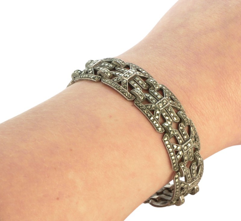 Článkový náramek vyrobený ze stříbra ryzosti 800/1000 zdobený markazity. Délka 17 cm. Celková hmotnost 36,64 g.