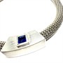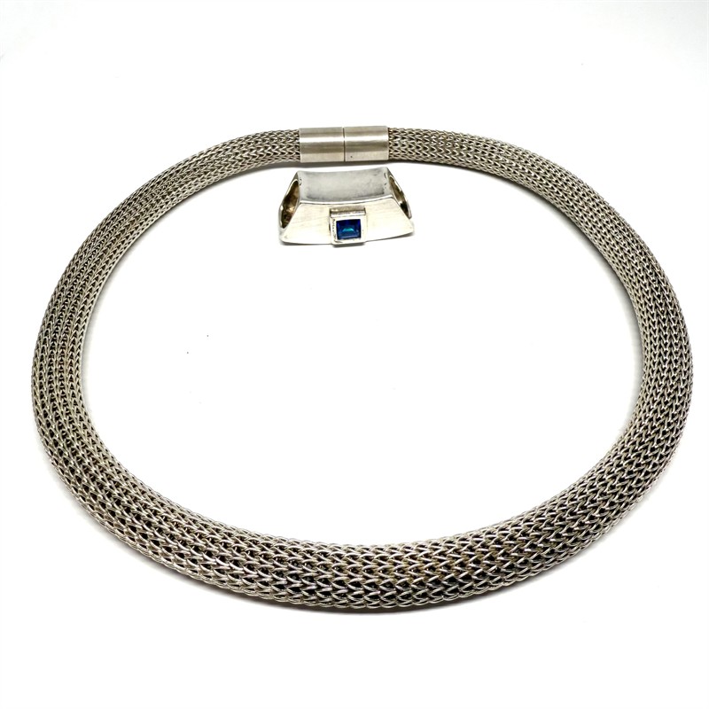 Designový náhrdelník z masivního stříbra. Šperk byl vyroben ze stříbra sterlingové ryzosti 925/1000, o celkové váze 62,40 g. Tvoří jej splétaný řetízek o průměru 9 mm ozdobený odnímatelným závěsem s ostře modrým spinelem, Nevšední, rafinované zapínání. Délka 45,5 cm. Perfektní stav.