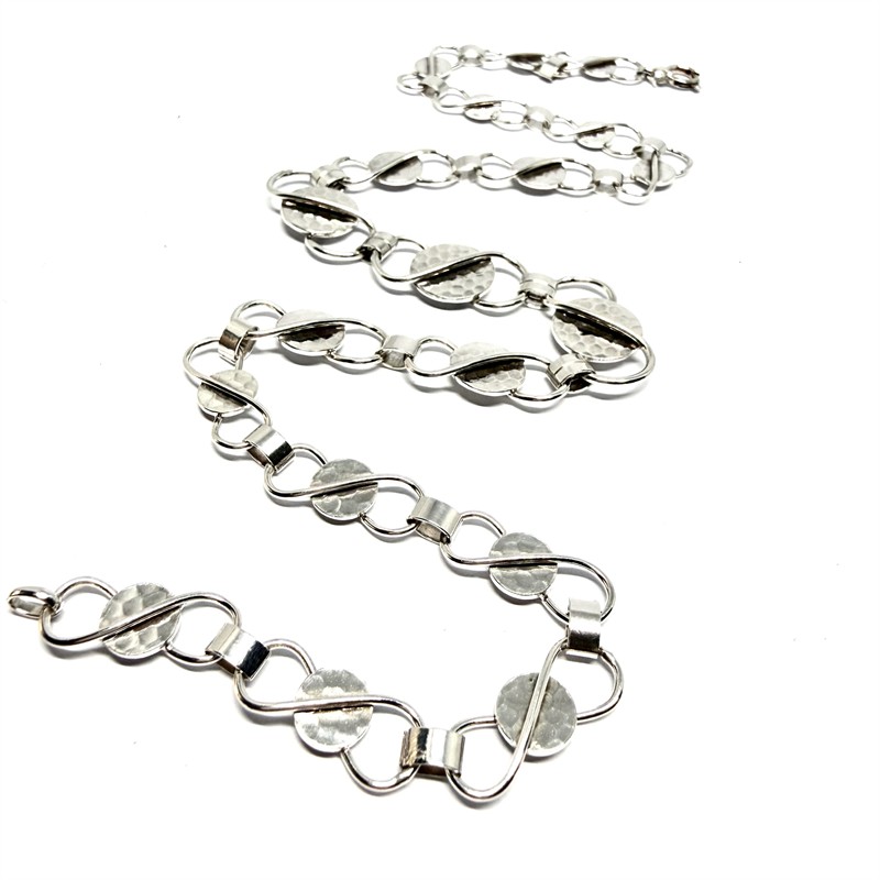 Nadčasový, designový, článkový náhrdelník. Šperk byl zhotoven koncem 1. poloviny 20.století ze stříbra ryzosti 835/1000. Váha šperku 24,31 g. Délka 45 cm. Šperk je tvořen geometrickými články na středu zdobenými intenzivním tepáním. Články se směrem ke středu zvětšují. Šperk byl profesionálně vyčištěn. Perfektní stav.