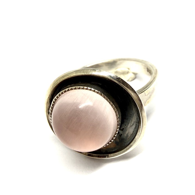 Nadčasový, designový prsten. Šperk zdobí hladce vybroušený kabošon růženínu. Prsten byl zhotoven ze stříbra ryzosti 935/1000. Celková váha 4,84 g. Velikost 52. Vyleštěno zlatníkem, perfektní stav.