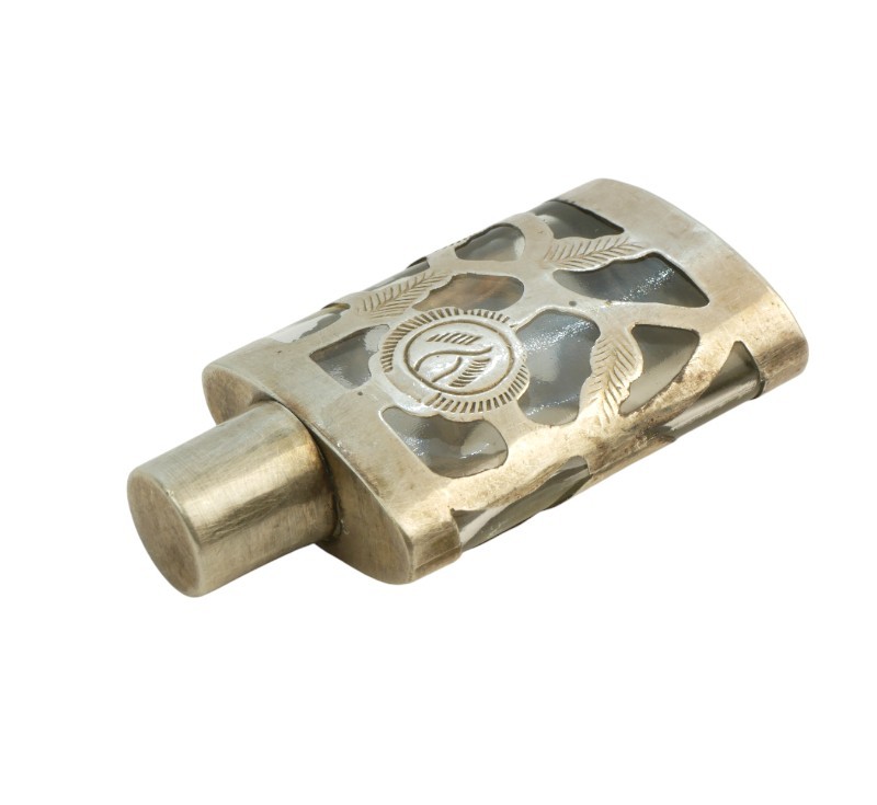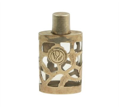 Flakonek ze stříbra ryzosti 925/1000, skleněná vložka. Výška 6 cm, celková hmotnost 25,18 g. Osvědčení Puncovního úřadu.