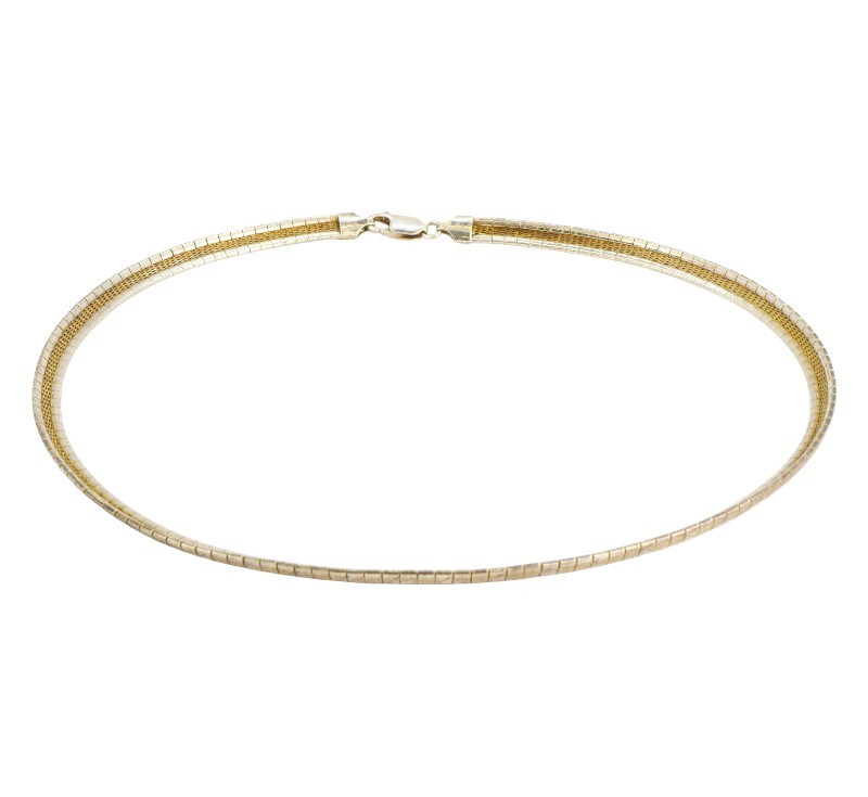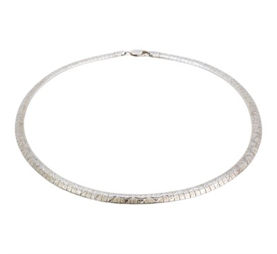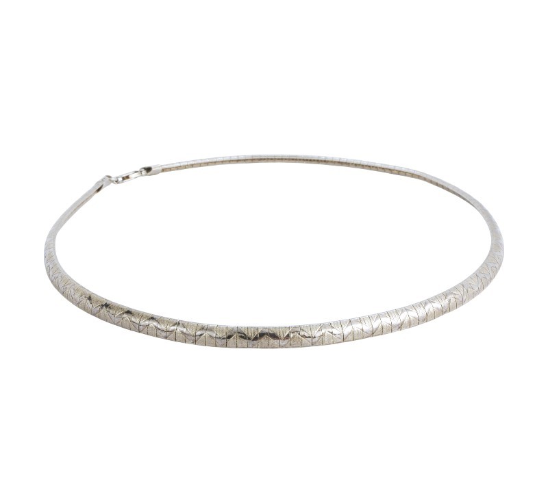 Náhrdelník vyrobený ze stříbra ryzosti 925/1000 zdobený jemným geometrickým gravírováním. Délka 40 cm. Celková hmotnost 25,02 g.