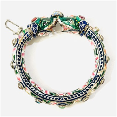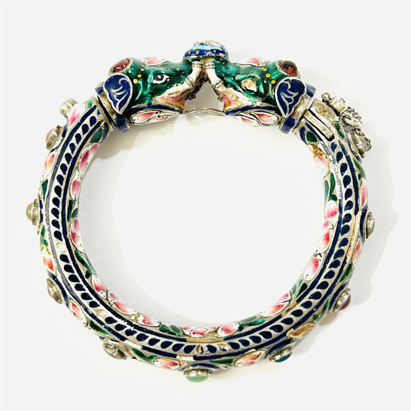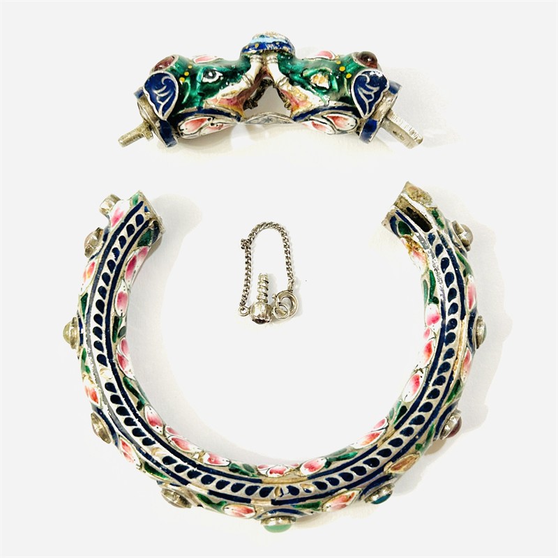 Nepřehlédnutelný, extravagantní masivní náramek ve tvaru kruhu s odnímatelnou zapínací korunou v podobě dvou sloních hlav. Po vnějším obvodu osazeno 13 kulatými muglemi z barevného skla podloženého fólií (z toho 9 kamenů po obvodu symbolizuje 9 planet (Navagrahas), jež jsou spjaty s hinduistickou ikonografií), bohatě zdobeno pestrobarevným smaltem s motivem růžových květů se zelenými lístky a modrým ornamentem, jež kontrastuje se samotným kovem. Mistrovská indická zlatnická práce z počátku 2. poloviny 20. století. Zhotoveno z nezlaceného stříbra o ryzosti 925/1000; vyhotoveno osvědčení puncovního úřadu; neznačeno. Hmotnost 56,10 g, vnější průměr 81 mm, vnitřní 58 mm, šířka 10 mm. Atypické šroubovací zapínání s pojistným řetízkem. Smalt místy poškozen, není příliš patrné, zohledněno v ceně, celkově v dobrém stavu, odborně vyčištěno a vyleštěno zlatníkem.