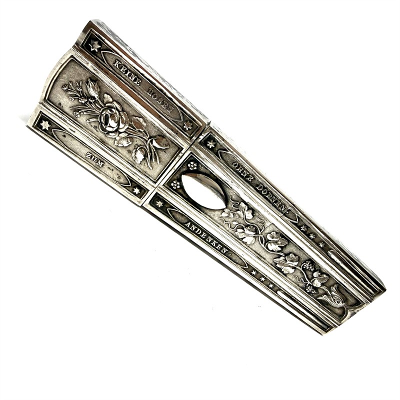 Malebný, velmi starý box sloužící k uskladněný jehel. Artefakt byl vyroben počátkem 2. poloviny 19.století ze stříbra netradiční ryzosti 850/1000. Váha 21,58 g. Zdobeno plastickým motivem růží a vinné révy. Rozměry cca 8 x 2,5 cm. Výborný stav.