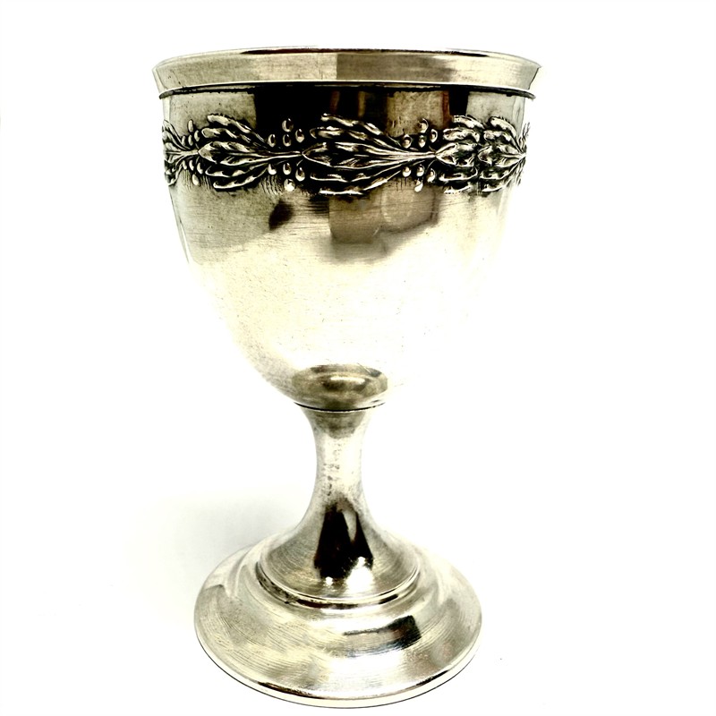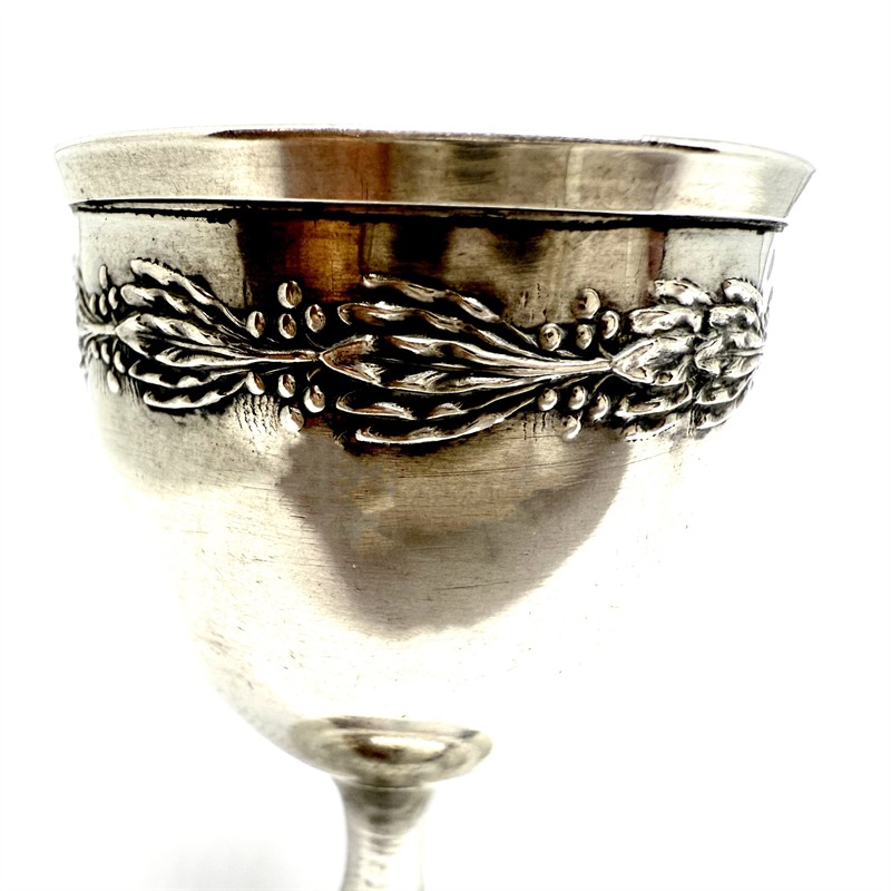 Půvabný, stříbrný kalíšek na vajíčko z konce 19.století. Artefakt zhotovený z neobvyklé ryzosti témeř ryzího stříbra 950/1000, hmotnost 15,91 g. Osvědčení Puncovního úřadu. Značeno na dvou místech mistrovskou značkou. Výška 6,8 cm. Velmi dobrý stav.
