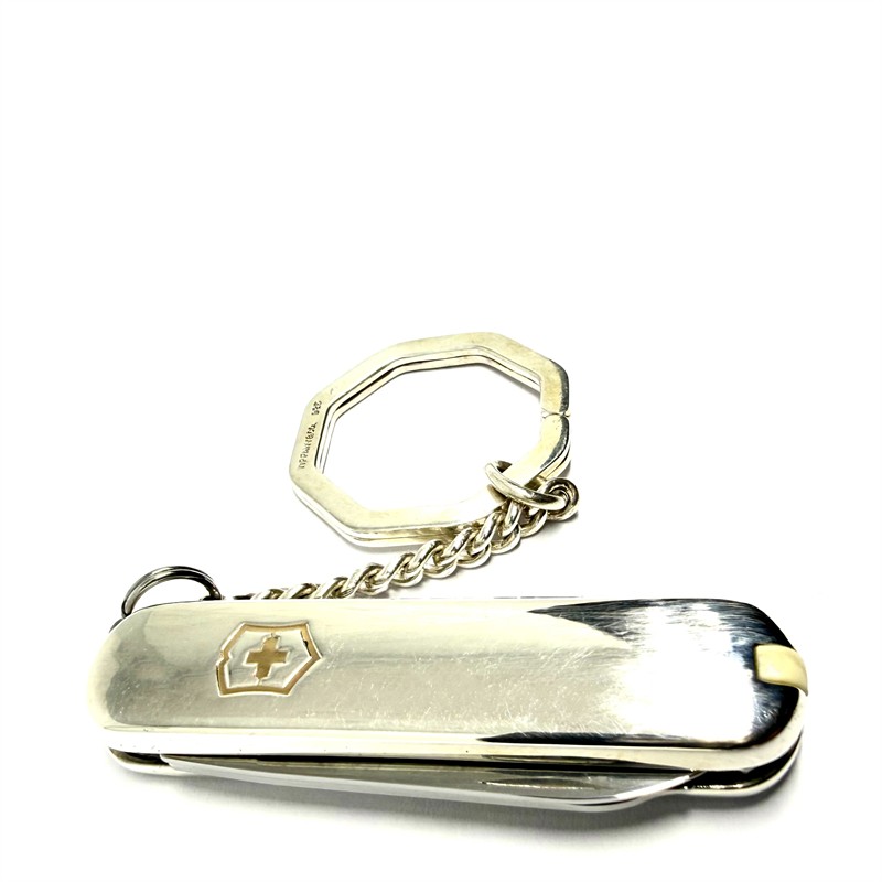 Unikátní, stříbrný kapesný nožík Victorinox zhotovený ve spolupráci s legendárním šperkařským domem Tiffany & Co.. Pouzdro nože bylo zhotoveno ze sterlingového stříbra (925/1000), znak Victorinox zlato 18K (750/1000) - obě ryzosti značeny na pouzdru nože. Užitné části vyrobeny z oceli. Celková váha 53,50 g. Rozměry 5,8 x 1,3 cm bez závěsného řetízku. Značeno. Perfektní stav.