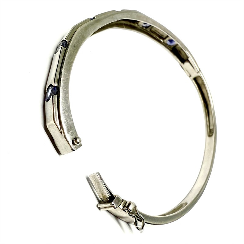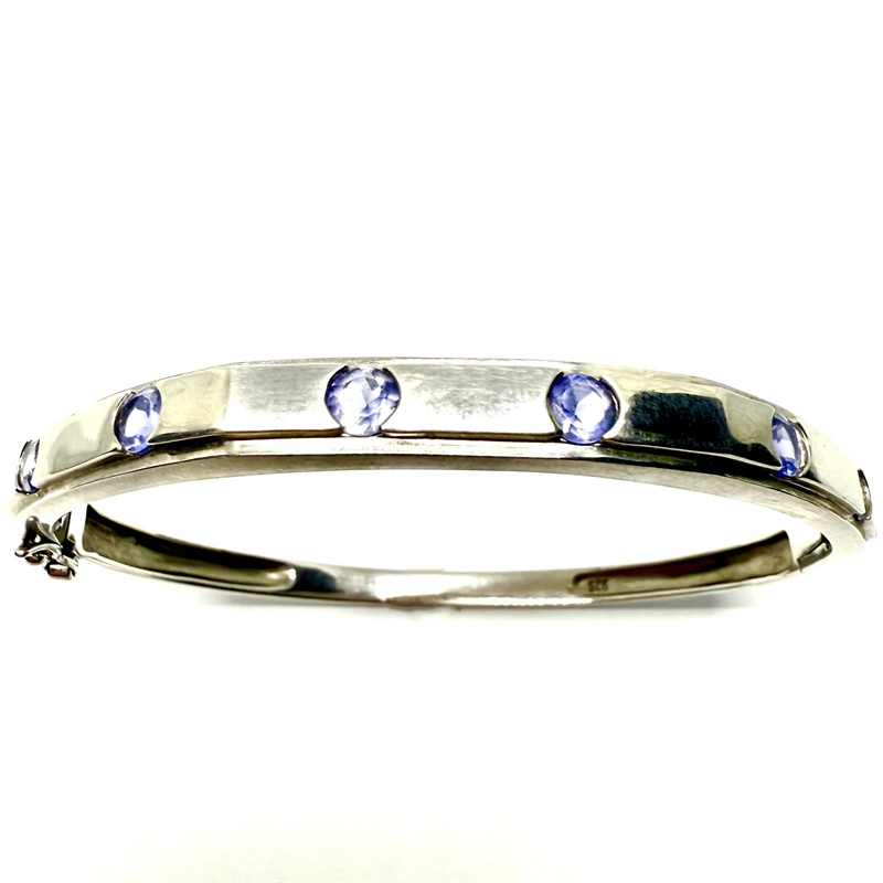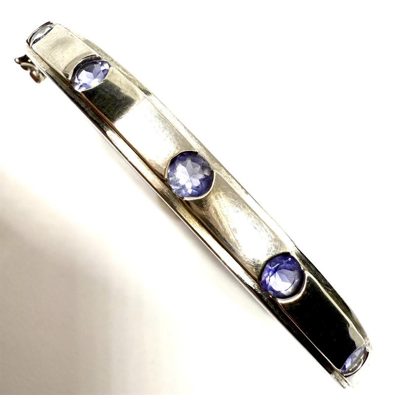 Originální, stříbrný náramek. Šperk byl vyroben ze stříbra ryzosti 925/1000 a nevšednost mu dodávají kosené plochy v přední části šperku. Ty zdobí šest ametystu, střední fialové sytosti, fazetového brusu. Váha 18,04 g. Šířka 7mm, průměr 7,2 cm. Šperk je vhodný i na statnější zápěstí. Perfektní stav.