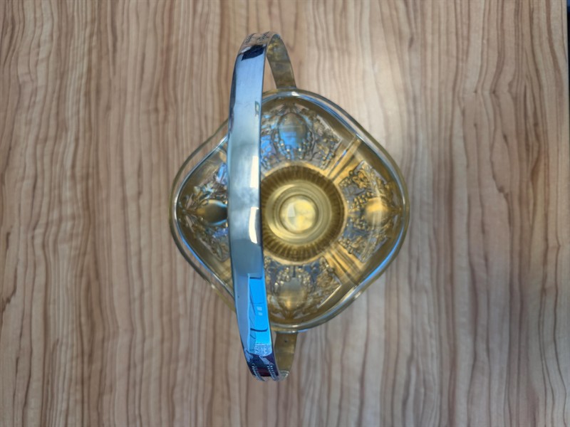 19 století, punc 800-stříbro, včetně skleněné misky ve tvaru košíku. Celková hmotnost 311gr, šířka 200mm, výška 240mm. Velmi pěkný stav.