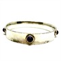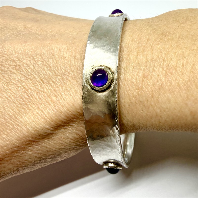 Originální, kruhový náramek. Nadčasový šperk byl zhotoven ze stříbra ryzosti 935/1000 kolem 2. poloviny 20.století. Povrch šperku je zdoben jemným, intenzivním tepáním a pěti ametysty velmi sytého odstínu, hladkého brusu kabošon. Celková váha 35,94 g. Šířka 1,2 cm. Průměr 6,5 cm. Perfektní stav.