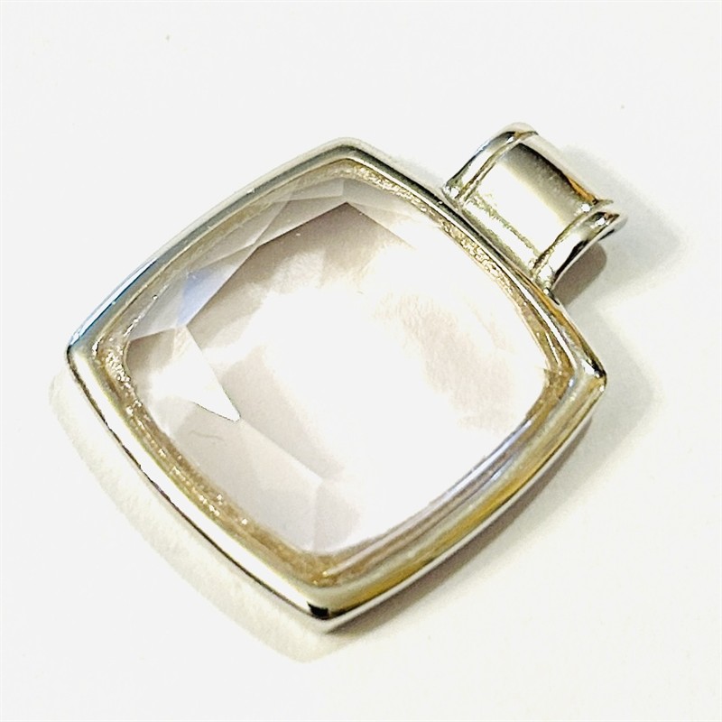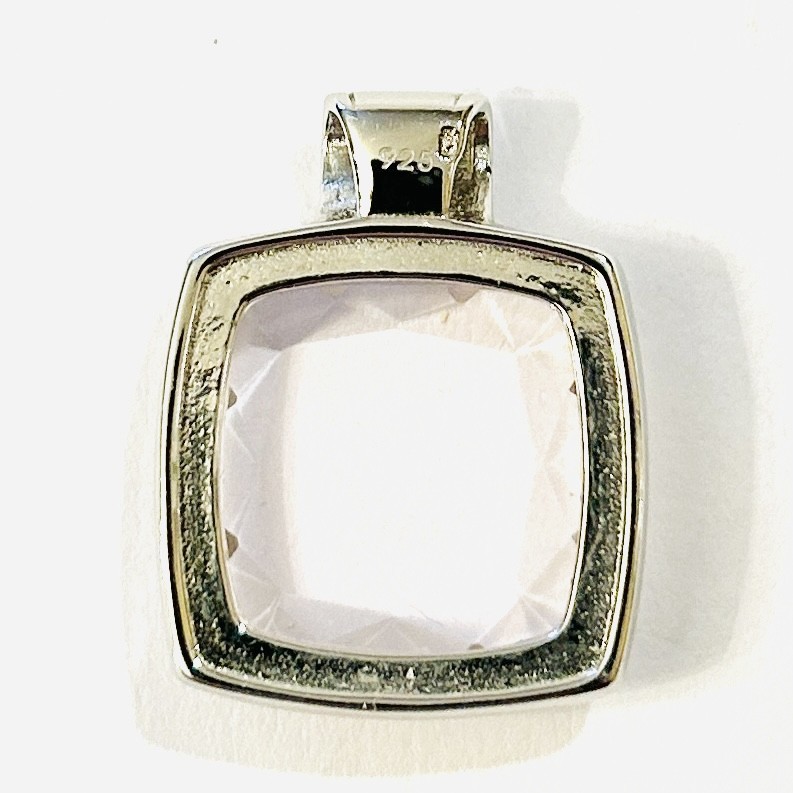 Moderní přívěšek s velkým přírodním růženínem čtvercového brusu, decentní minimalistický rámeček. Západoevropská zlatnická práce z 10. let 20. století. Zhotoveno z nezlaceného stříbra o ryzosti 925/1000; punc S-61 (kozlík 2) a ryzostní číslo na oušku. Hmotnost 5,33 g, délka 26 mm, šířka 20,5 mm. Nikdy nenošeno, stav nový, tedy intaktní.