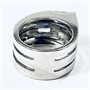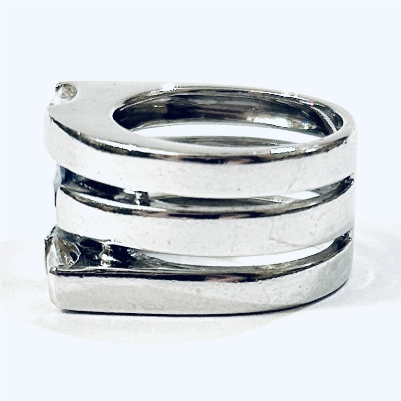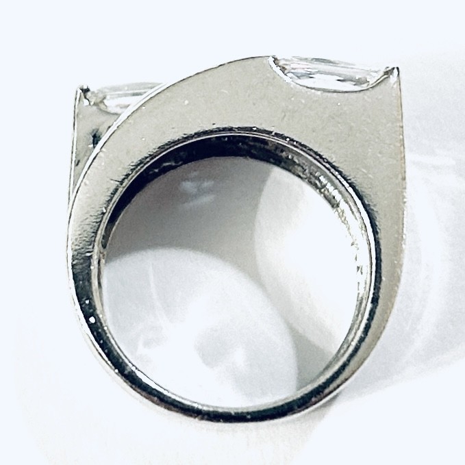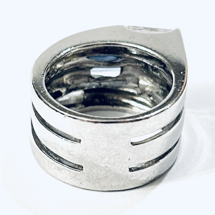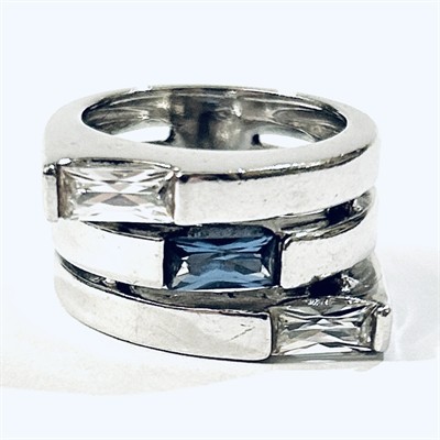 Výrazný, moderně pojatý prsten s prořezávanou šínou, z níž krajní pásy při hlavici protilehle vystupují, osazeno modrým a čirými syntetickými kameny bagetového brusu. Solidní italská práce z počátku 21. století. Zhotoveno z nezlaceného stříbra o ryzosti 925/1000; nově opatřeno puncem S-61 (kozlík 2), italský punc a ryzostní číslo zevnitř šíny. Hmotnost 12,48 g, velikost 55, šířka hlavice 12 mm. Stopy nošení, jinak v dobrém stavu, odborně vyčištěno a vyleštěno zlatníkem.