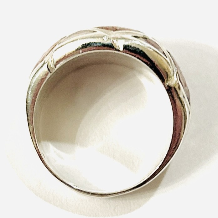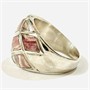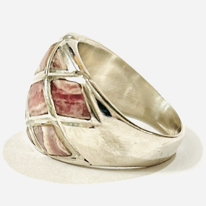 Masivnější, moderně pojatý prsten vykládaný leštěnými přírodními rodonity, solidní, patrně mimoevropská práce z konce 20. století. Zhotoveno z nezlaceného stříbra o ryzosti 925/1000; nově opatřeno puncem S-61 (kozlík 2) a stornované ryzostní číslo zevnitř šíny. Hmotnost 6,95 g, velikost 54, šířka 15 mm. V zachovalém stavu, odborně vyčištěno a vyleštěno zlatníkem.