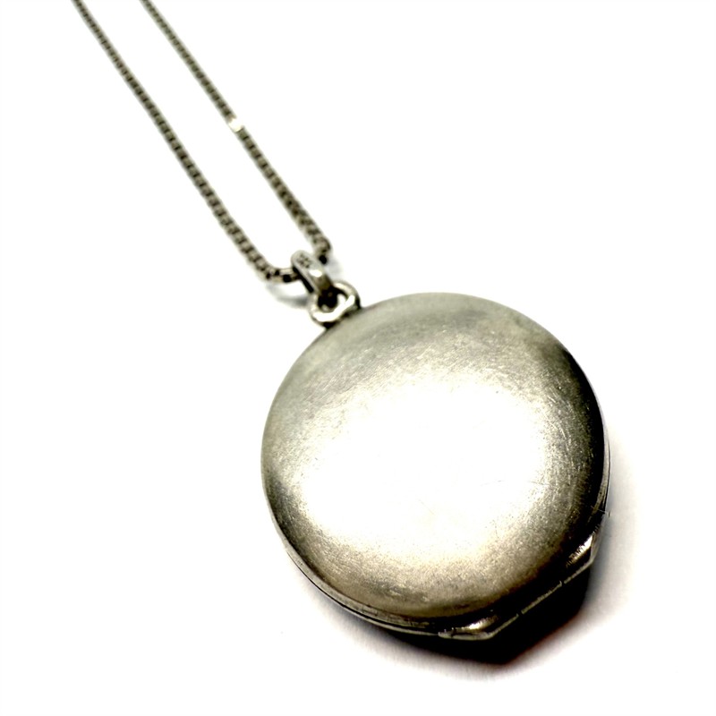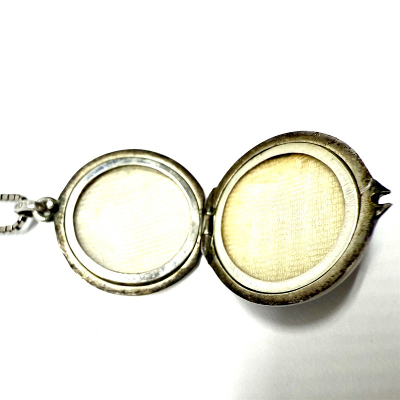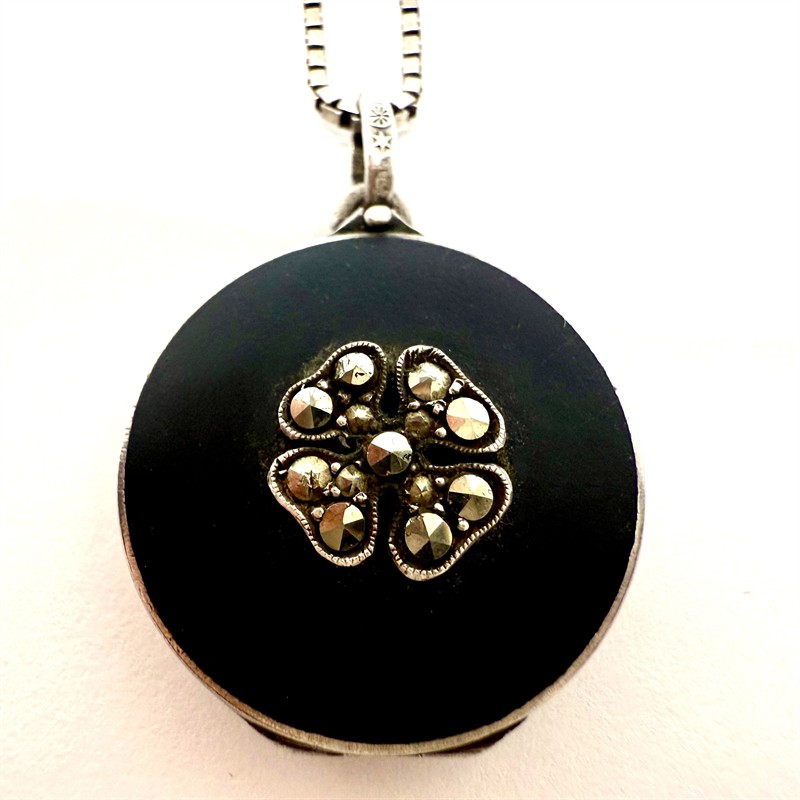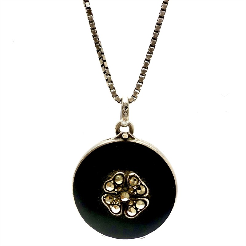 Půvabný, stříbrný náhrdelník s odnímatelným závěsem - medailonem. Šperk zdobí jemně matovaný černý smalt s kontrastním, plasticky vyvedeným čtyřlístkem. Ten zdobí lesklé markazity. Stříbro ryzosti 935/1000, řetízek o délce 41 cm ze sterlingového stříbra (925/1000). Celková váha 8,57 g. Starý, autentický šperk ve výborném stavu.