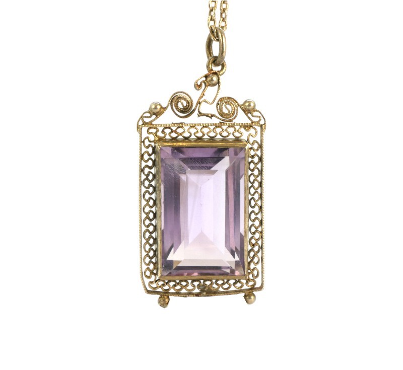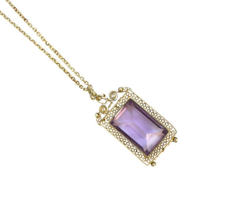 Stříbrný secesní náhrdelník osazený velkým ametystem, stříbro ryzost 900/1000, hmotnost 8,17 g. Rozměr závěsu 3,5 x 1,9 cm. Délka řetízku 50 cm.