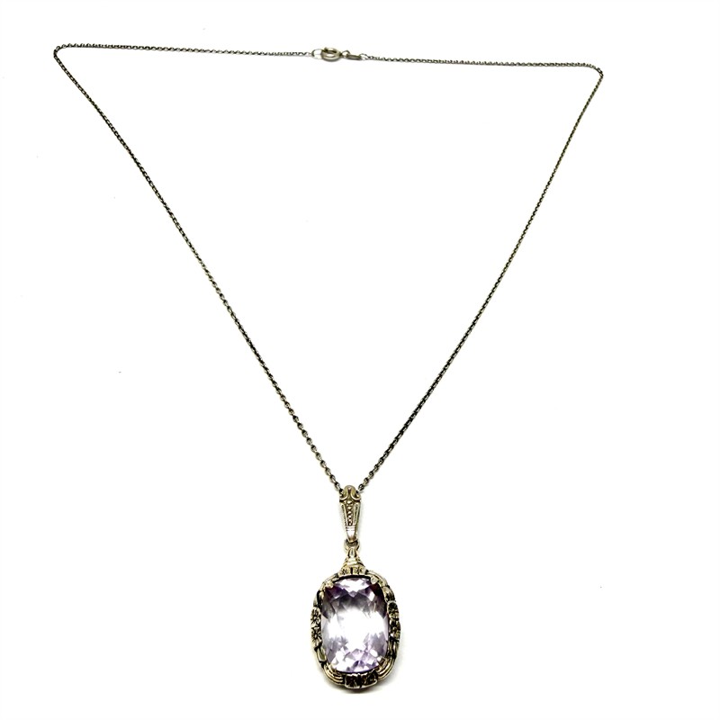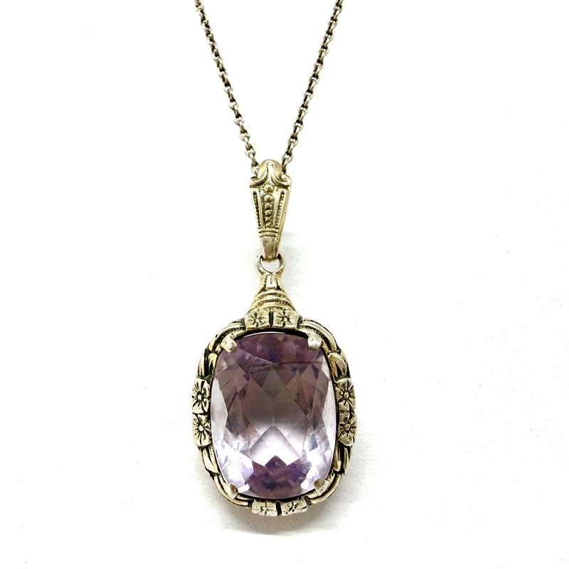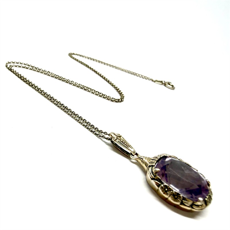 Půvabný stříbrný náhrdelník - jemný řetízek a odnímatelný závěs. Šperku vévodí ametyst střední fialové sytosti, fazetového brusu. Kámen je zasazen do půvabného rámečku s florálním motivem. Šperk byl zhotoven z decentně zlaceného stříbra ryzosti 835/1000. Řetízek sterlingové stříbro (925/1000). Celková váha 5,36 g. Délka řetízku 46 cm. Šperk je v perfektním stavu.